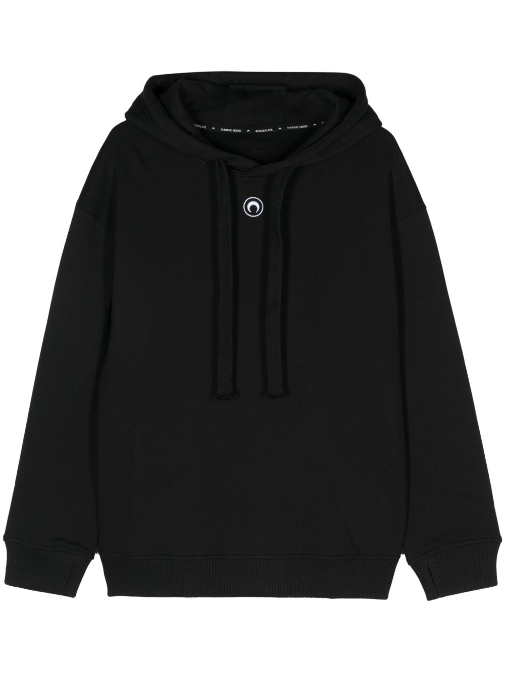 black organic cotton jersey texture Crescent Moon embroidery drawstring hood long sleeves ribbed cuffs and hem straight hem Moon cotton hoodie.