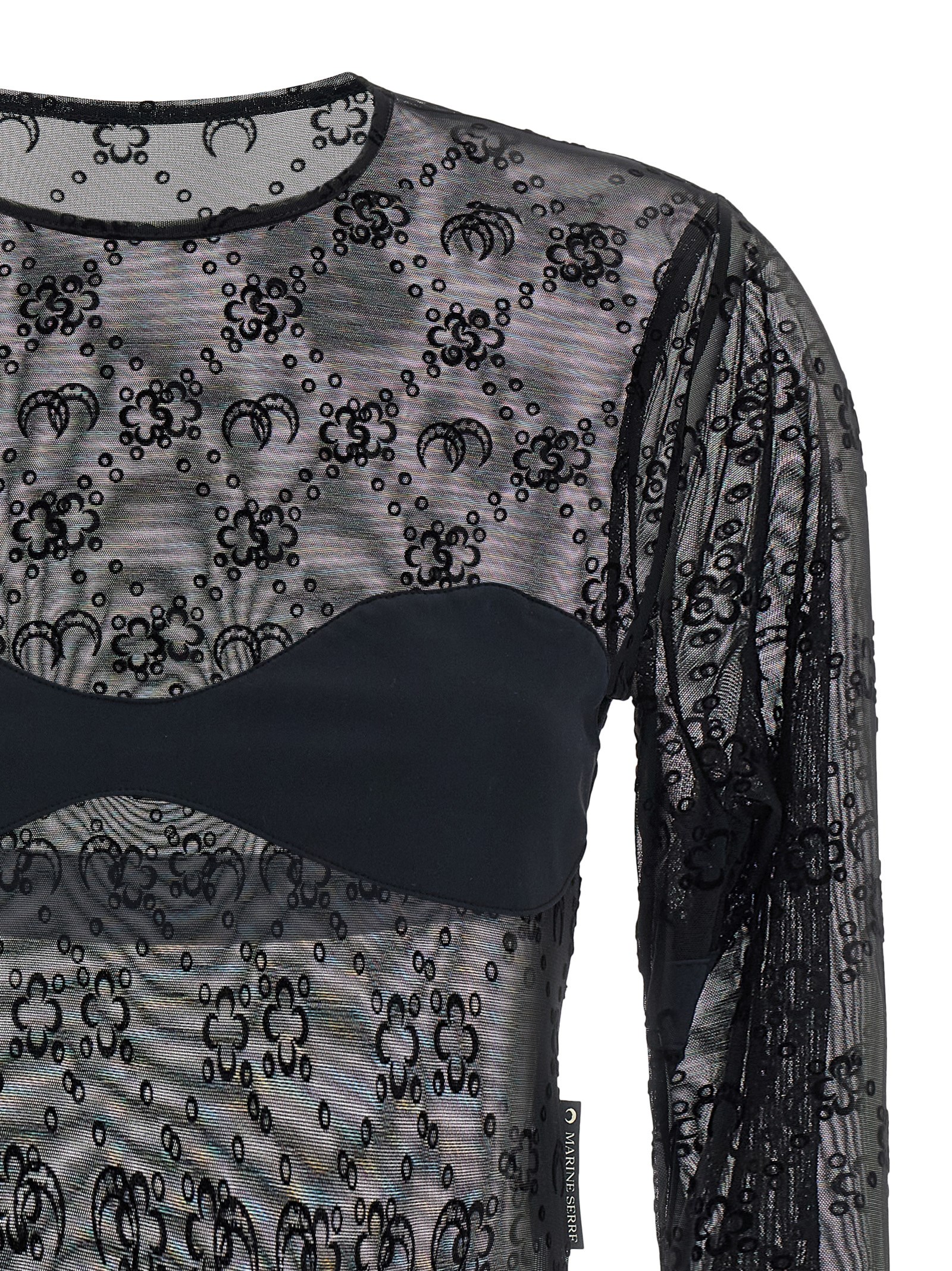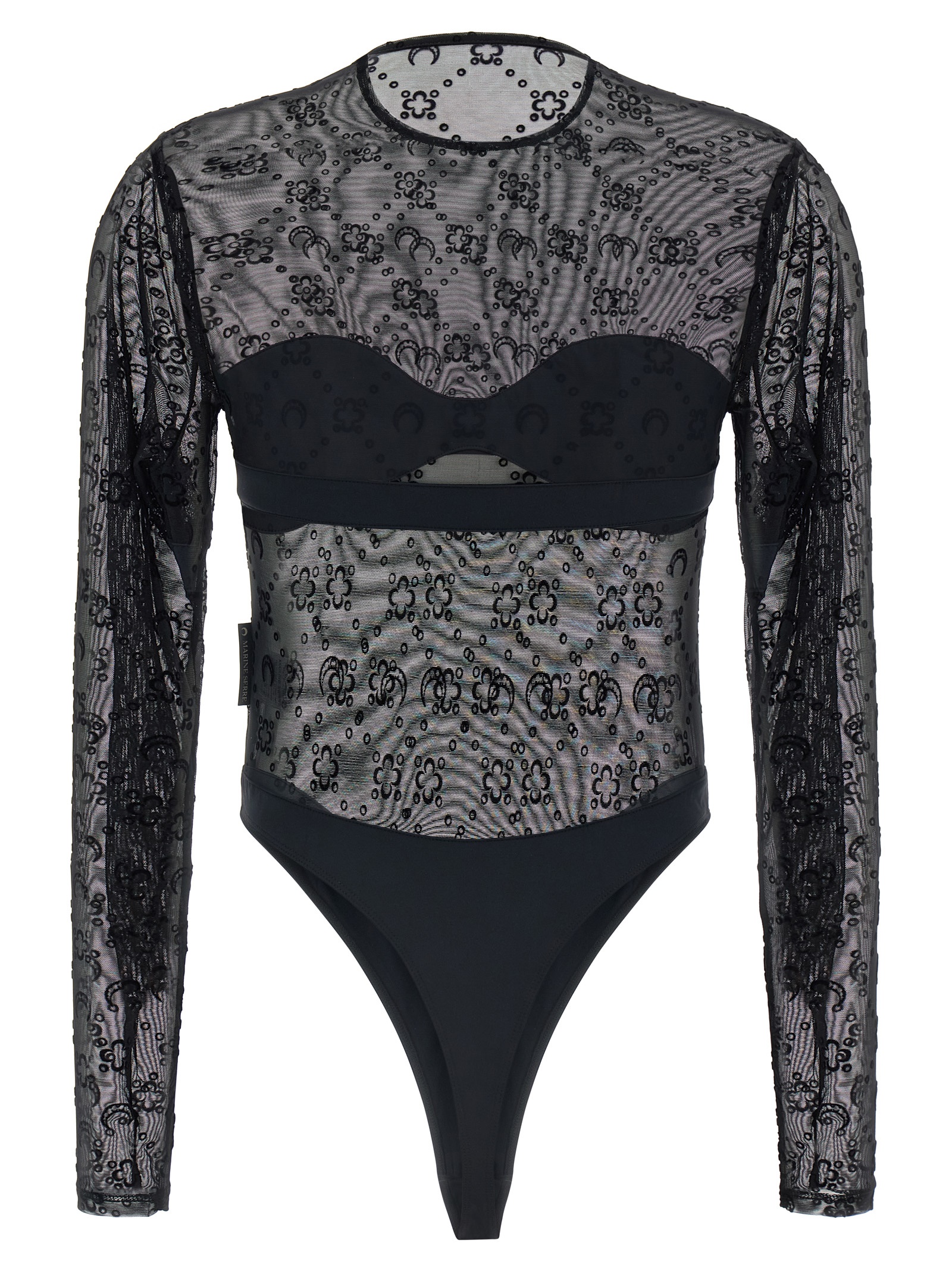 Semi-transparent mesh bodysuit with opaque details and all-over tone-on-tone flocked ‘moonogram’ logo, Crew neck, Long sleeves, Wide leg width, Snap buttons on the hem. Size and Fit – true to size fit