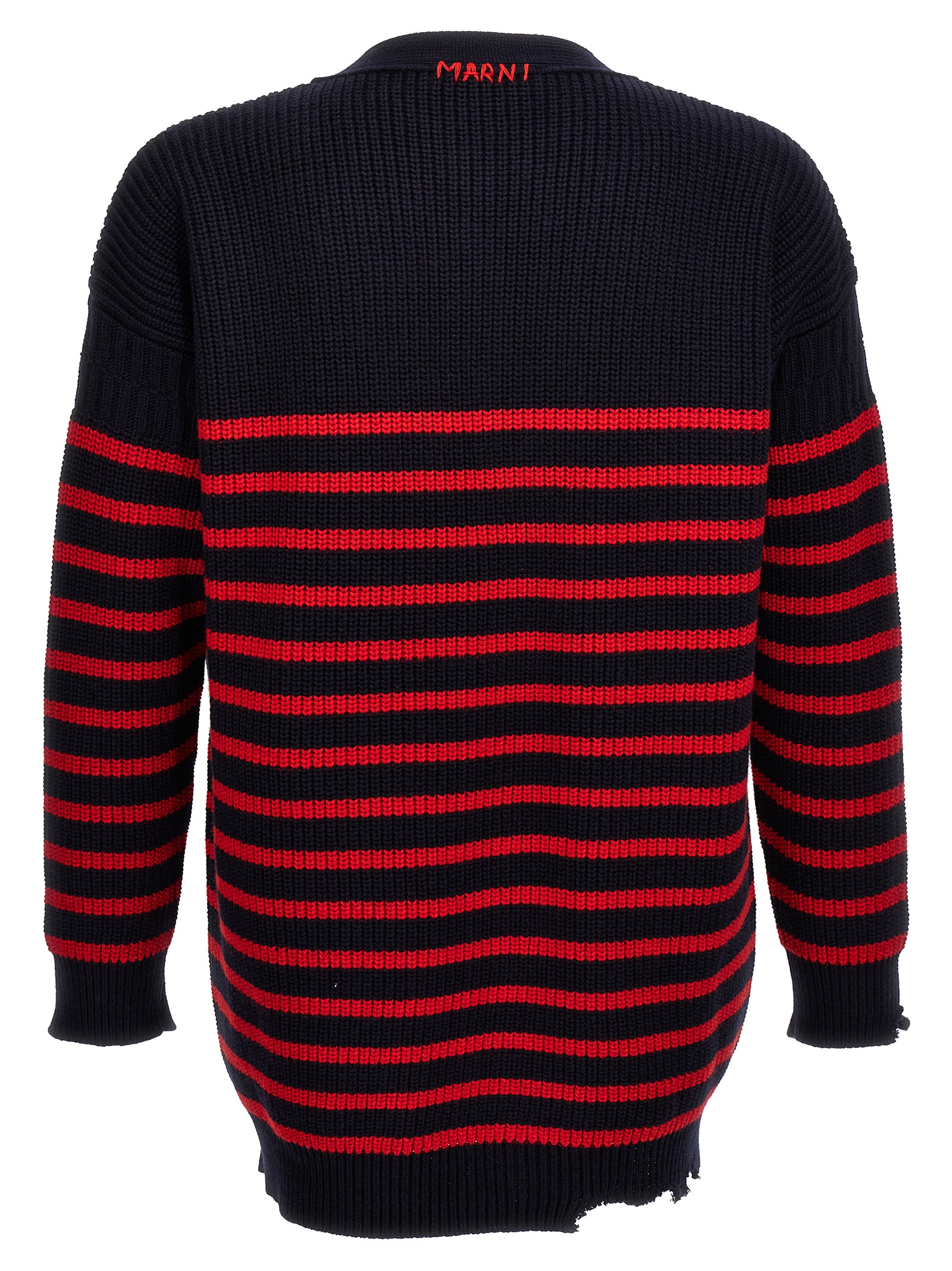 Striped wool cardigan with destroyed effect details, front pocket, button closure, long cuffed sleeves.