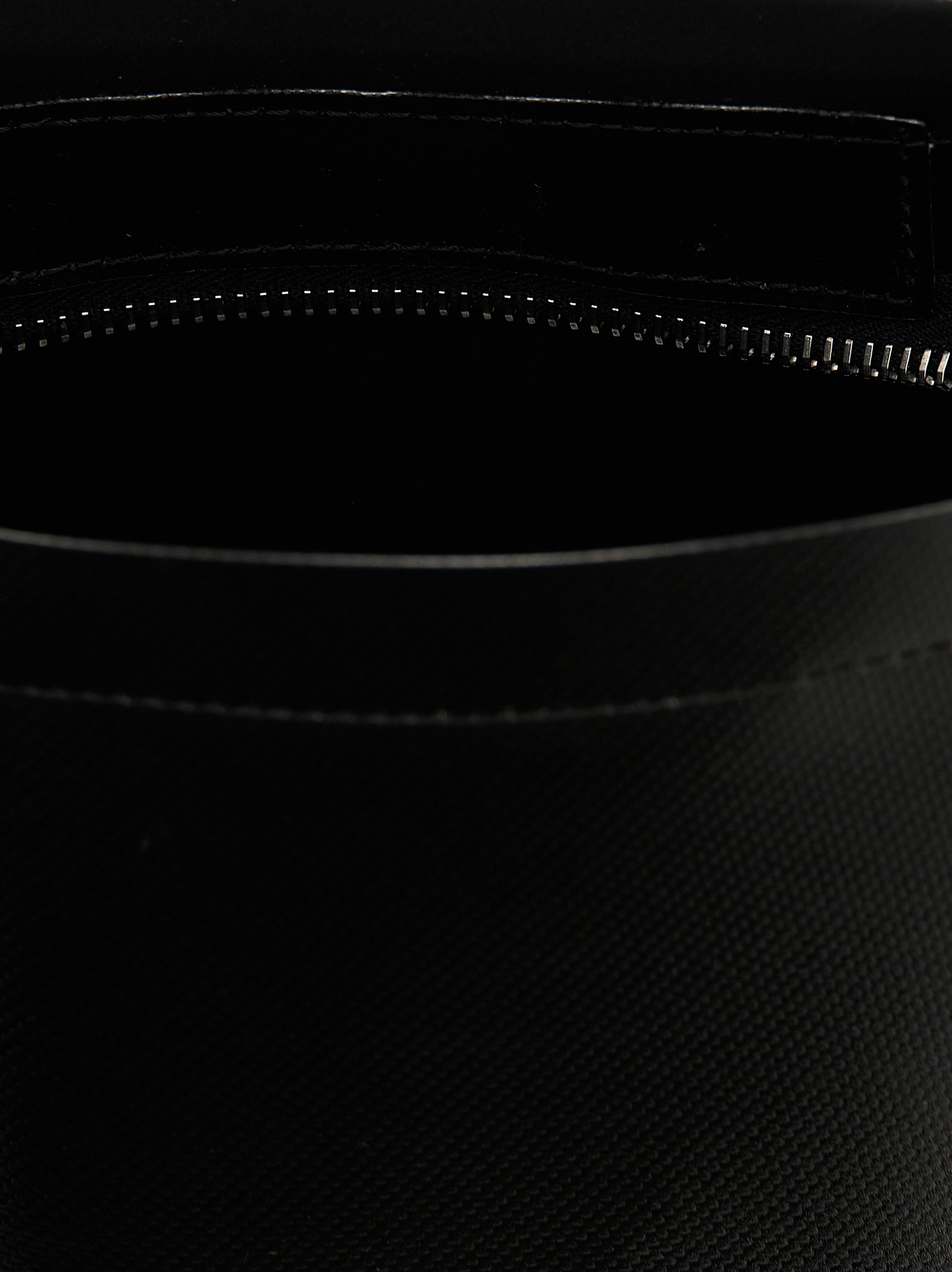Plastic shoulder strap, front embossed logo, zip closure, adjustable fabric shoulder strap.