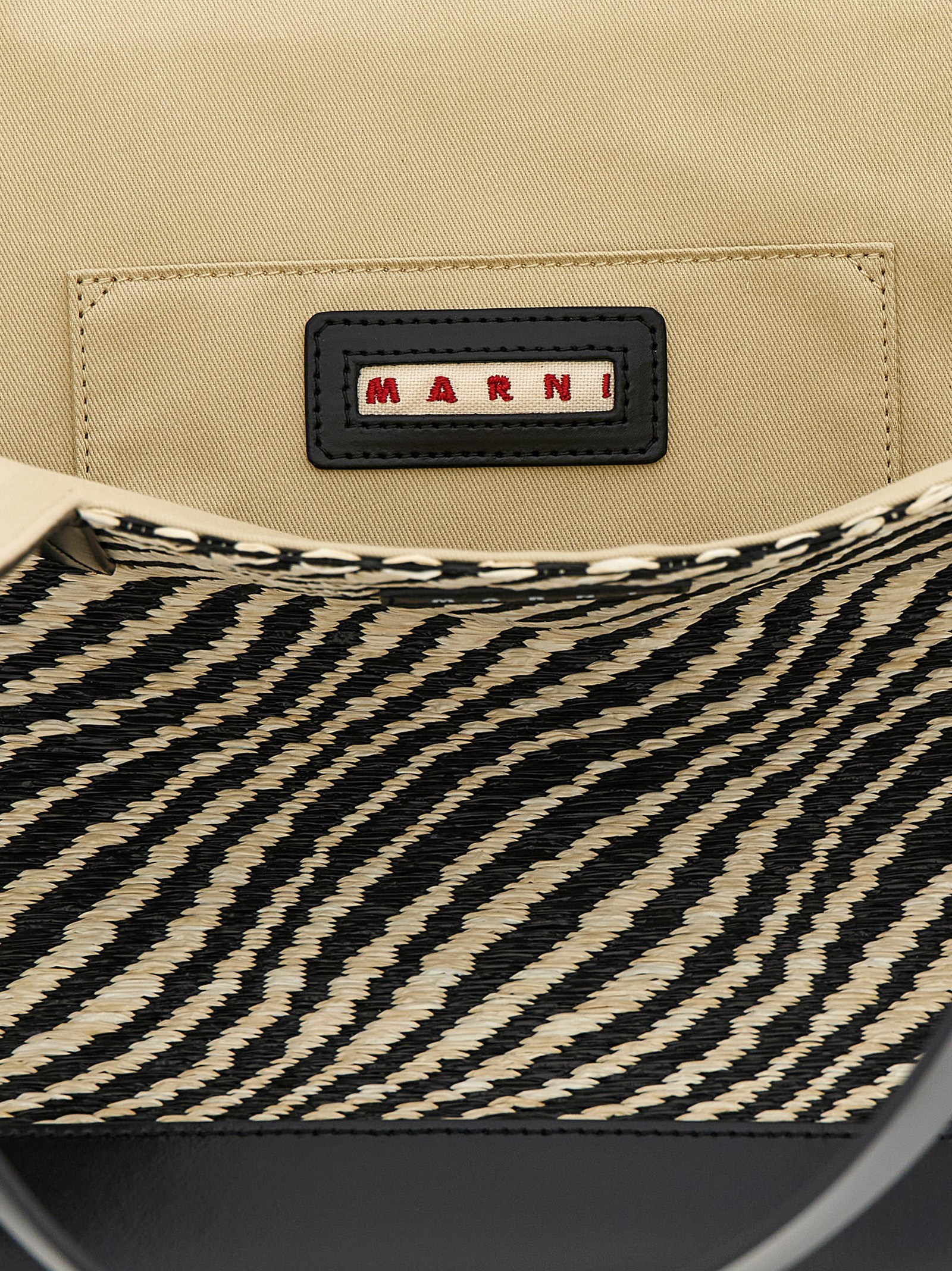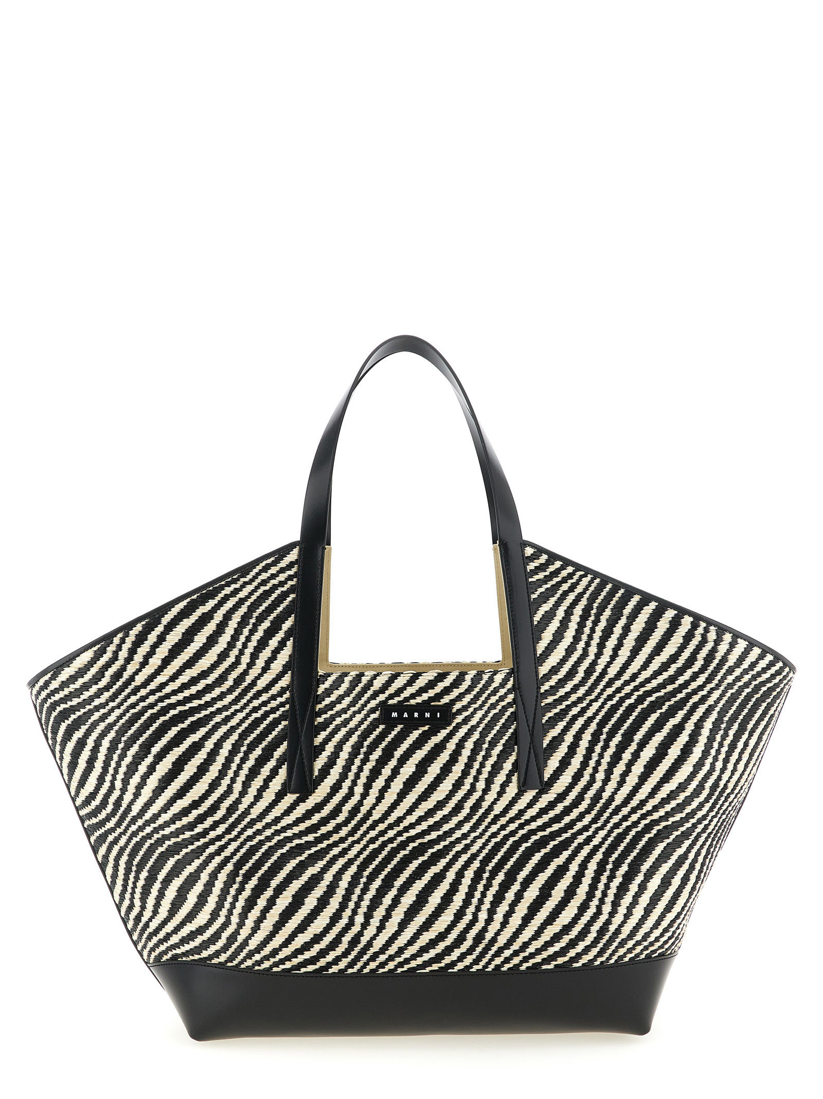 ‘Waves’ trapezoidal raffia-effect fabric with side openings, leather details, double fixed leather handle, front leather logo patch.