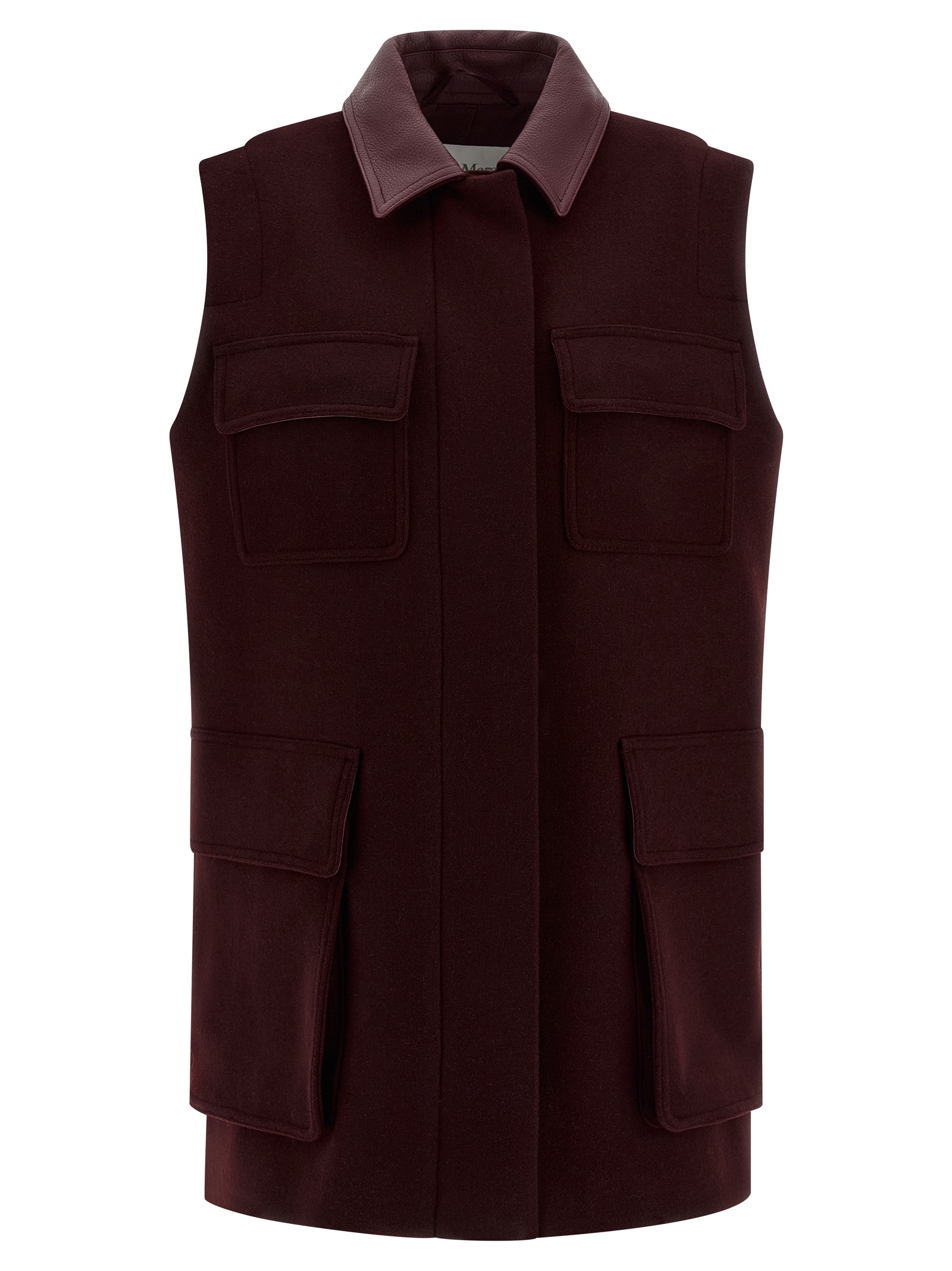 ‘Aeroso1234’ vest in double wool, alpaca and cashmere cloth, tone-on-tone leather shirt collar, front zip and snap button closure, pockets, back vents, lining with leather trim.