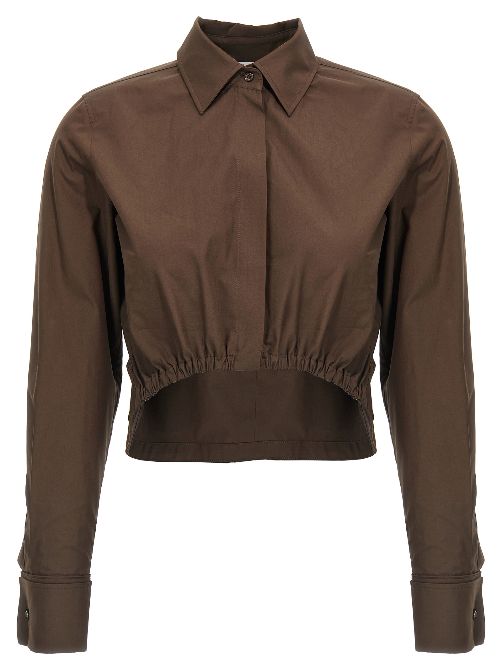 ‘angio’ cotton poplin shirt, Pointed collar, Cropped length, Curled at the bottom with elastic means, Asymmetric length, Long sleeves with cuffs.