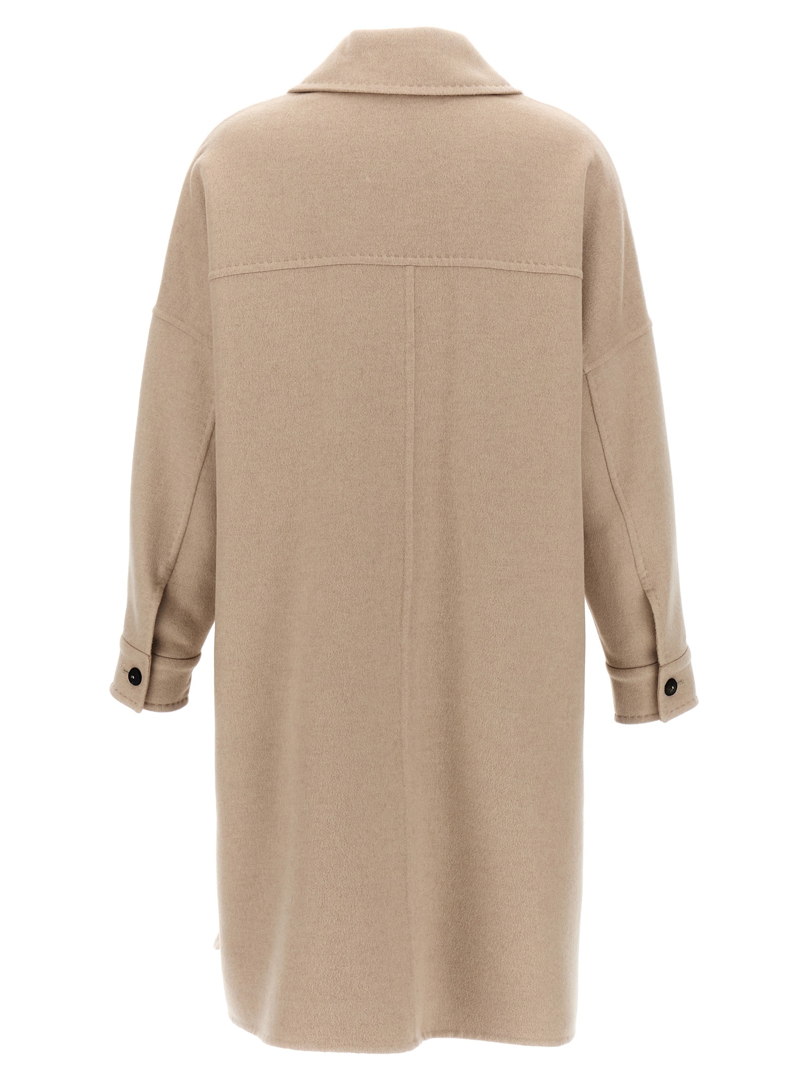 ‘Baruffa’ double cashmere coat with chemise style with button closure, leather details, pockets, long sleeves, side slits. Canvas dress holder and custom hanger.