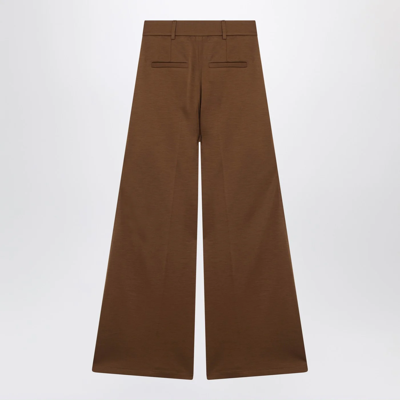 Max Mara palazzo trousers in pure brown wool jersey featuring double front pleats at the waist wide leg high waistband with zip and hook closure slanted side pockets welt back pockets and belt loops.