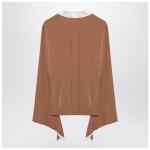 Camel coloured silk shirt from Max Mara featuring a fluid fit, contrasting colour-block detailing, a pointed collar, long sleeves with ruffled cuffs, rounded side slits and a concealed front button fastening.