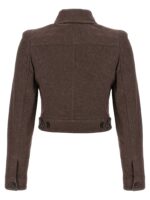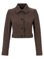 ‘carpa’ blazer in pure cotton denim effect fabric, Lined crop model, Front and shoulder pins, Front button closure, Long cuffed sleeves, Structured shoulders. Size and Fit – Slim fit