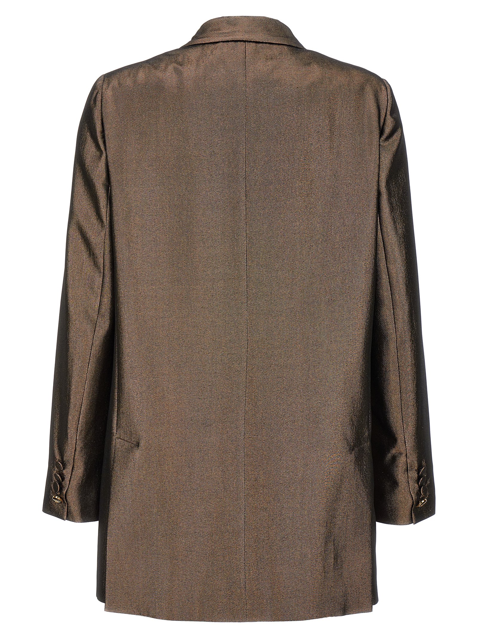 ‘Edro’ lamé blazer jacket in brown silk charmeuse, double-breasted button closure, peak lapels, pockets, back vents, long sleeves.