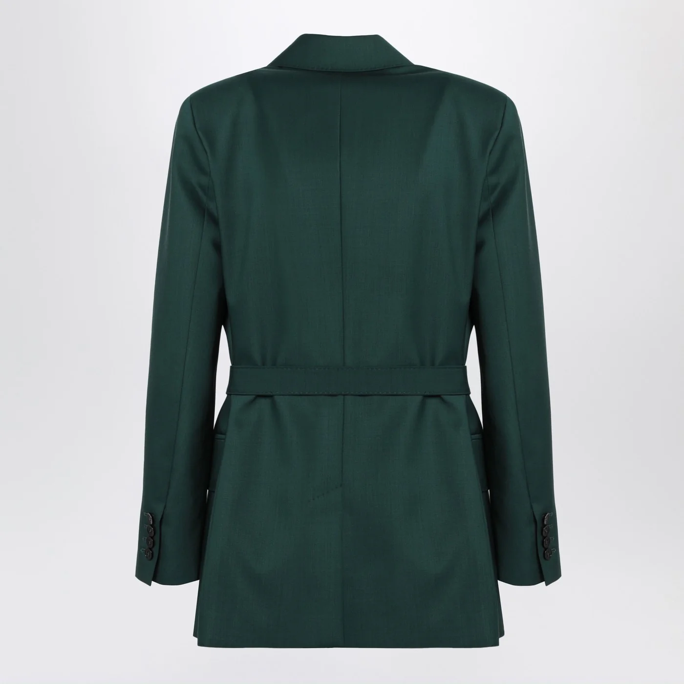 Single-breasted jacket by Max Mara in dark green virgin wool fabric characterized by a buttonless design a tie belt at the waist a vent at the back notch lapels long sleeves with buttoned cuffs and two flap pockets at the front.