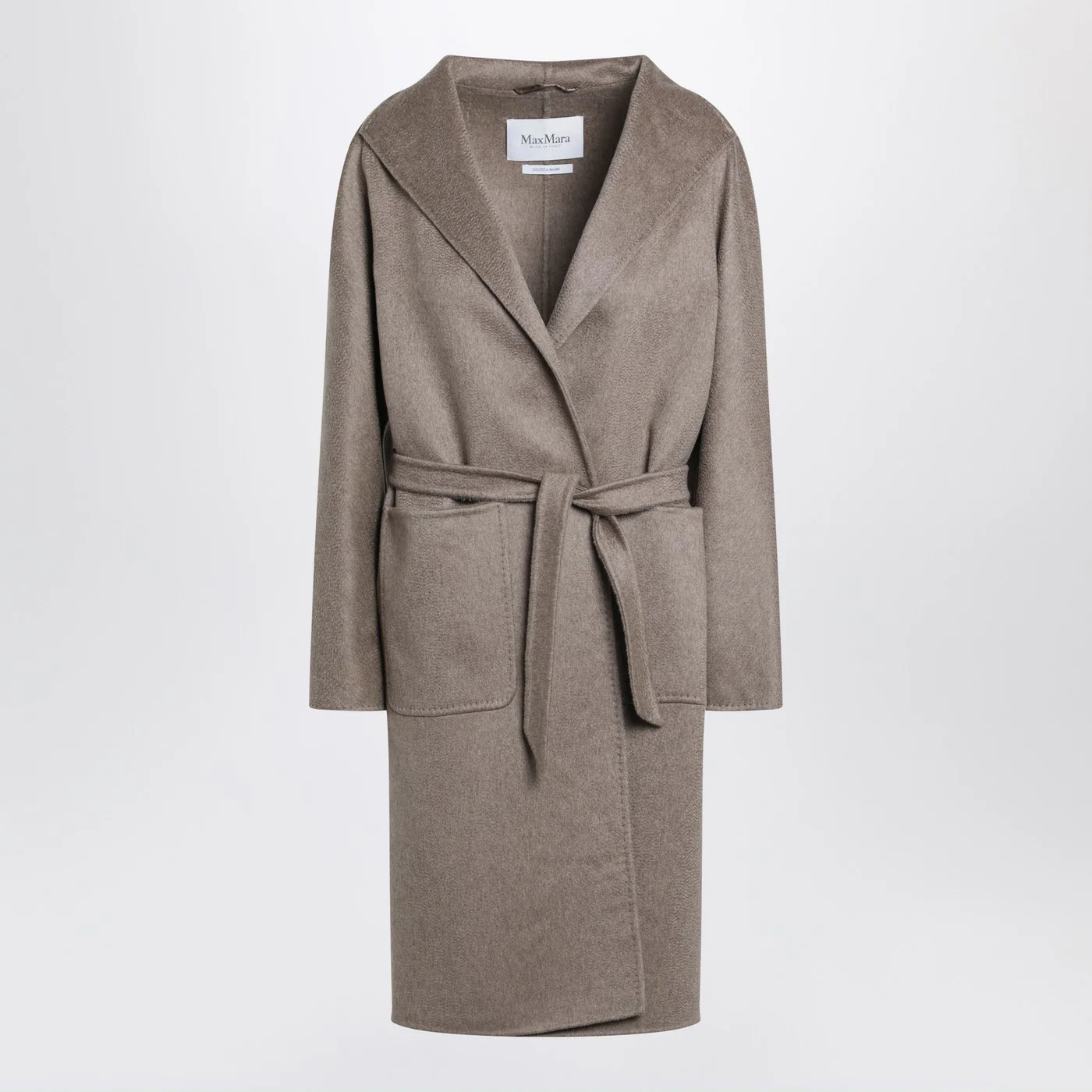 Midi cardigan coat by Max Mara in hazelnut double cashmere drap featuring straight cardigan-inspired silhouette kimono long sleeves matching belt closure front patch pockets and unlined design.