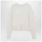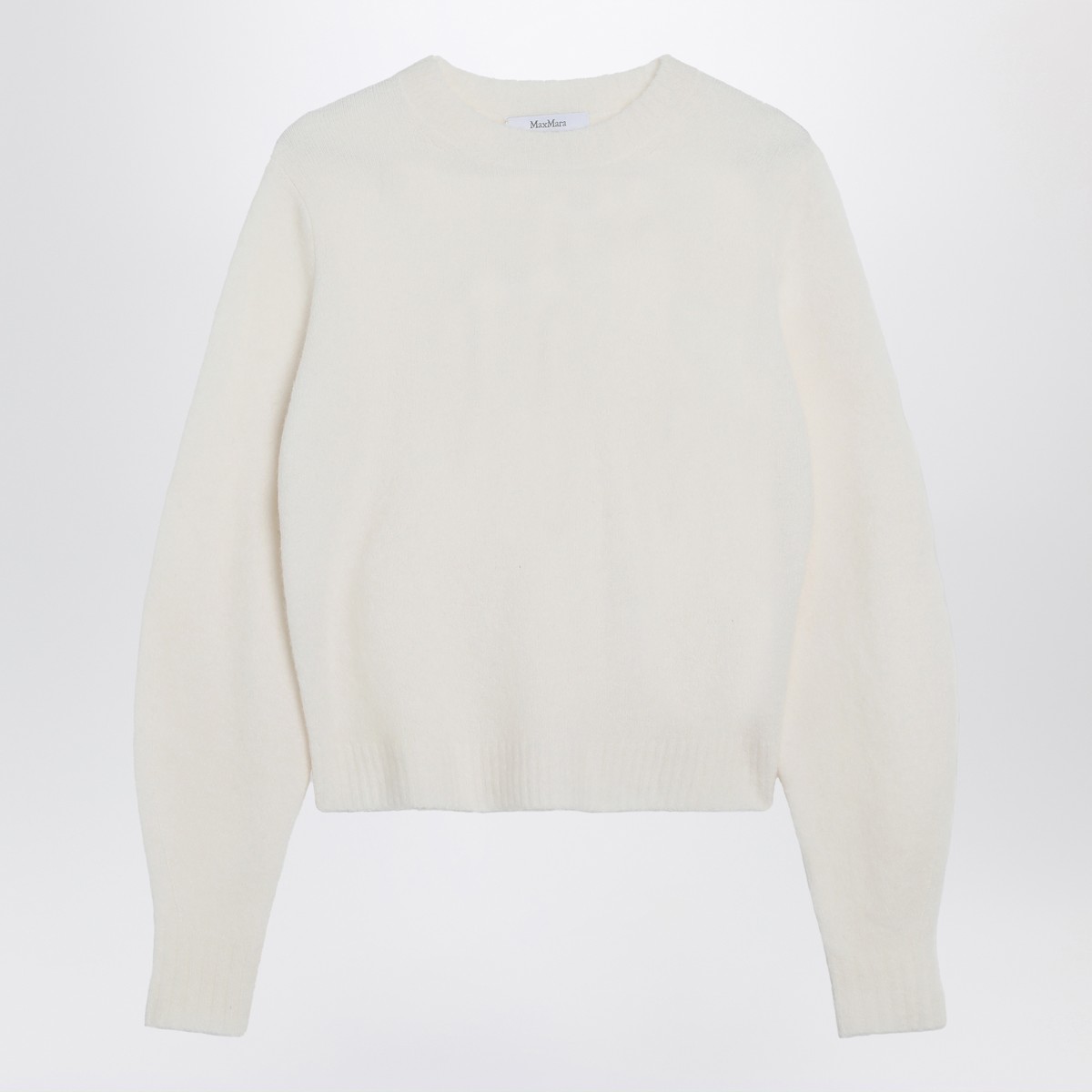 Max Mara sweater in ivory stretch cashmere blend yarn, characterized by a wide round neckline, long sleeves with dropped shoulders, and ribbed edges.