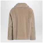 Max Mara short teddy coat made of alpaca and wool Teddy fabric on a silk base, oversized fit, shirt collar, wide dropped-shoulder sleeves, concealed front closure with jeweled buttons, side welt pockets and Monogram jacquard lining in gold lurex fabric.