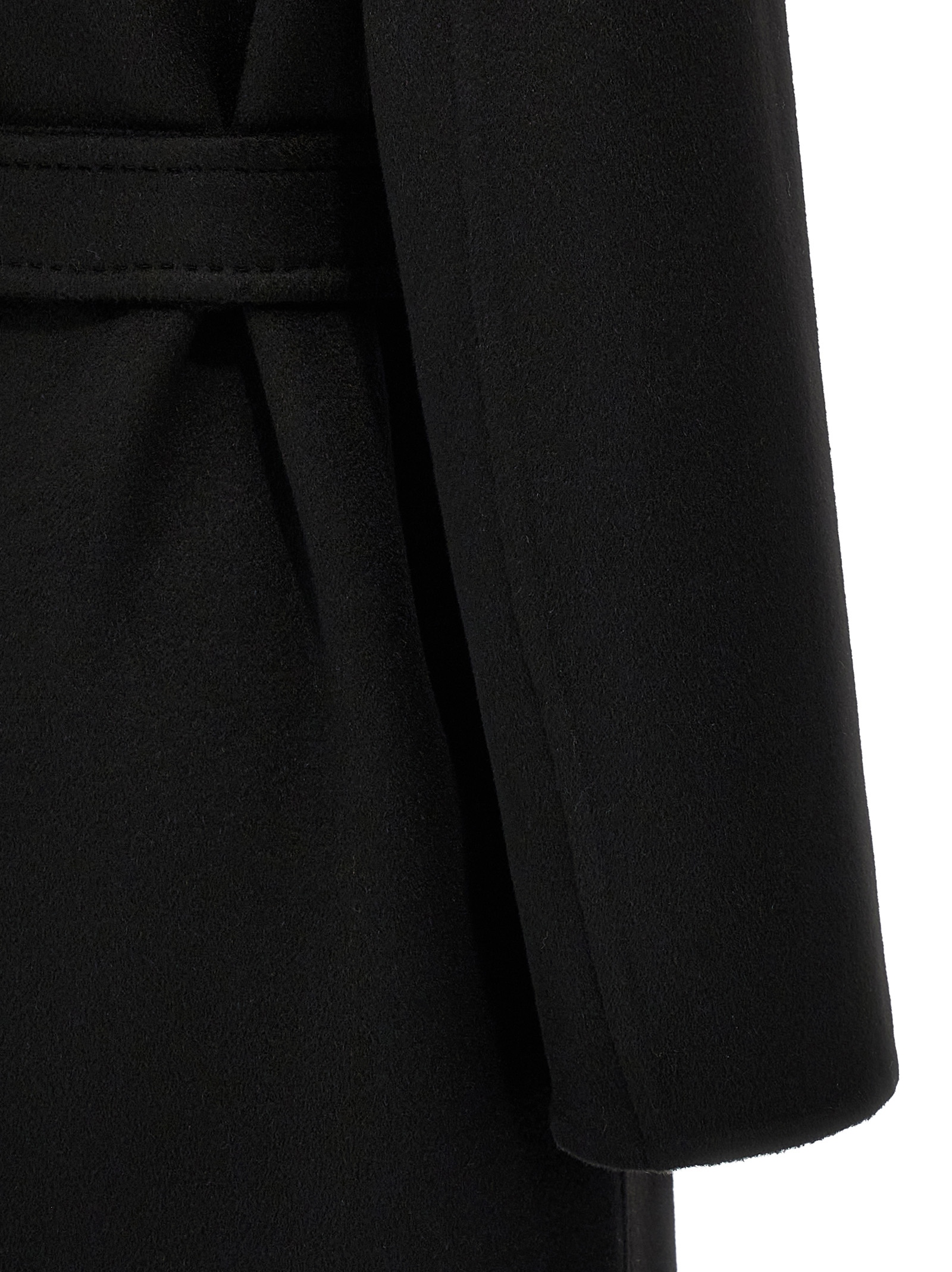 ‘Melinda’ midi coat in double cashmere fabric with robe style, long sleeves with dropped shoulder, pockets, back slit, removable belt.