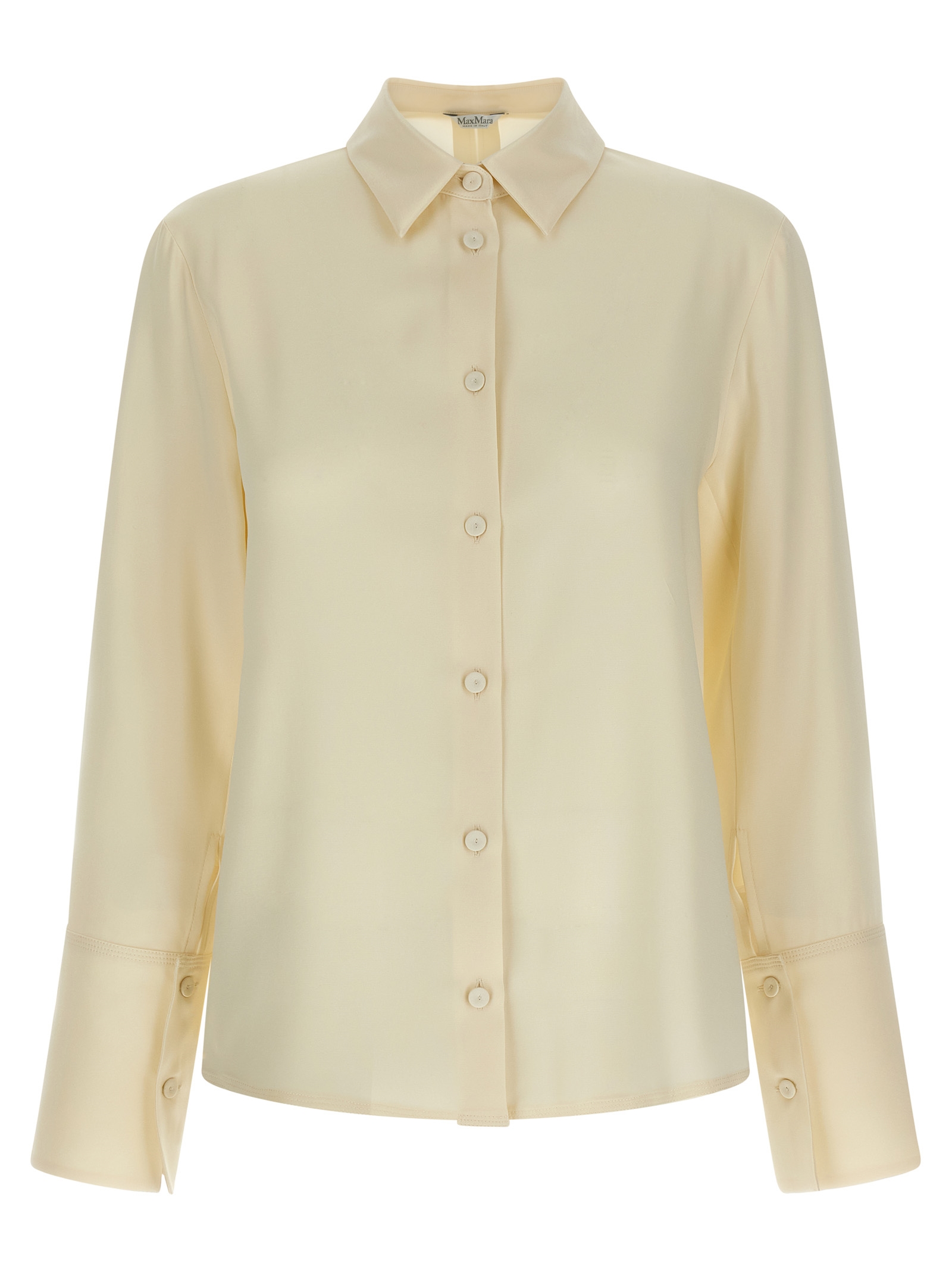 ‘MxpVoliera’ stretch silk crêpe de Chine shirt with front button closure, long sleeves with maxi cuffs, and asymmetrical hem.
