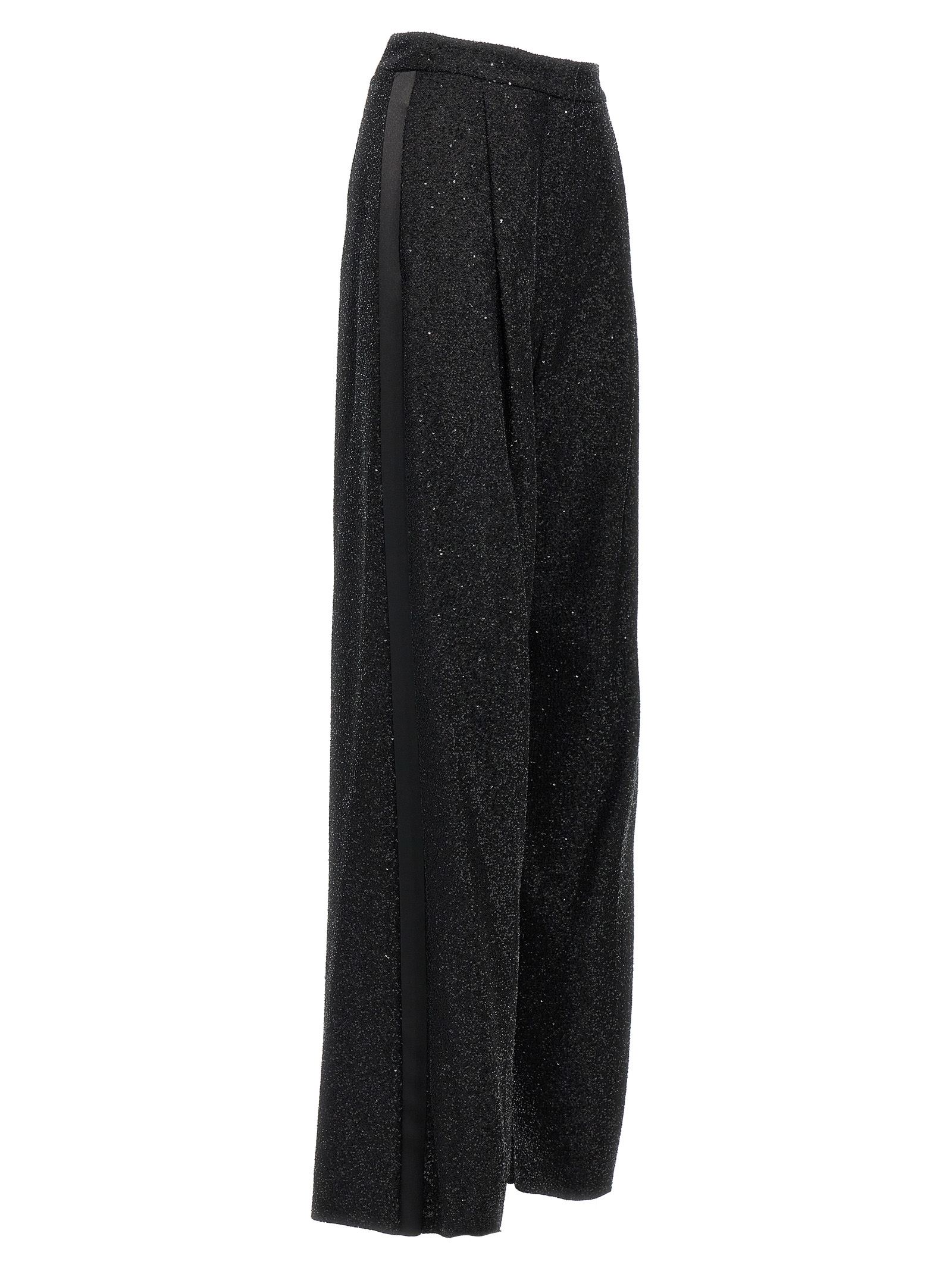 Navigli’ wool blend pants with all-over micro sequin appliqué, satin side bands, zip and hook closure, pockets, pin tucks and wide leg.