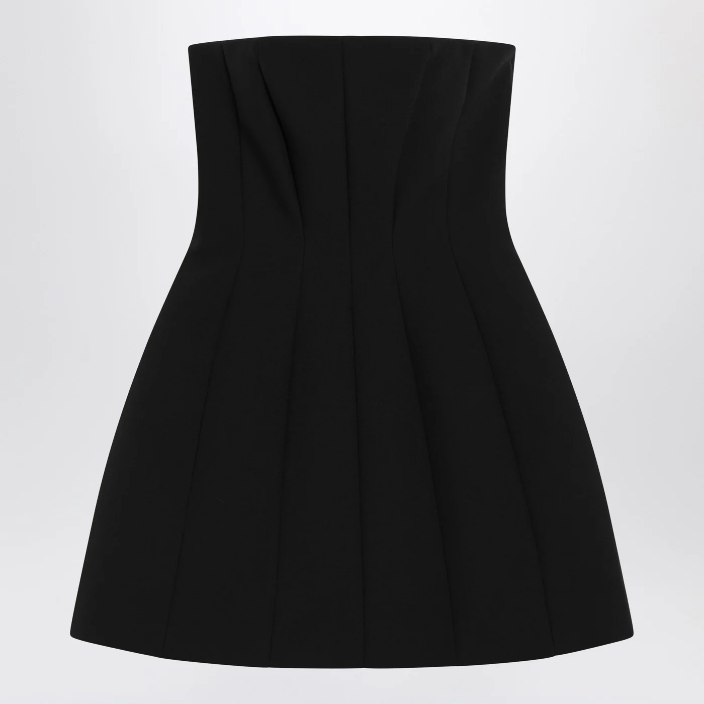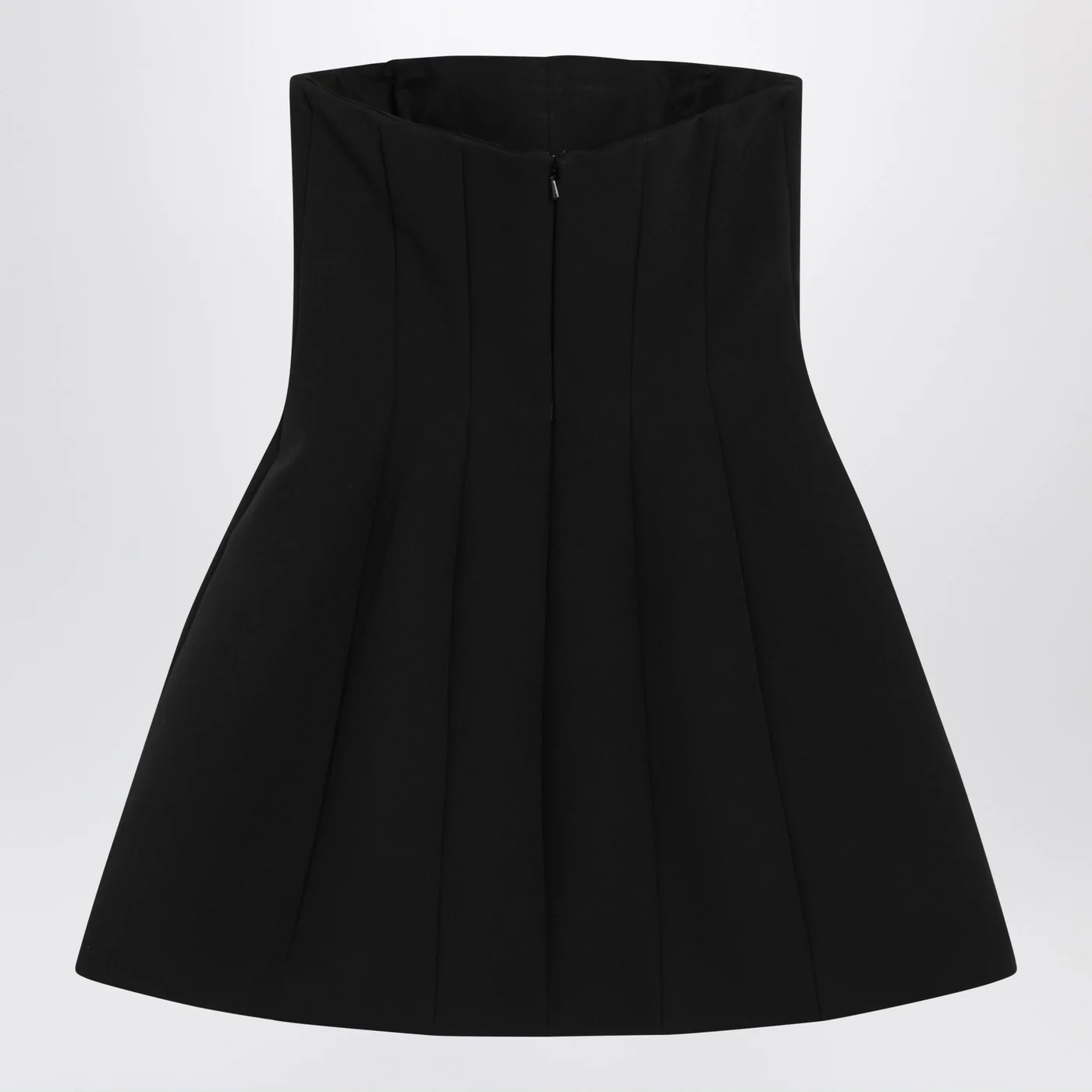 Short bustier dress by Max Mara Pianoforte in black stretch sable characterized by a fitted silhouette with vertical cut patterns at the waist a zip closure at the back two side pockets and a removable underskirt. Size and Fit – Model wears size 40 IT Model measurements: Height: 178 cm Chest: 89 cm Waist: 62 cm Hips: 88 cm