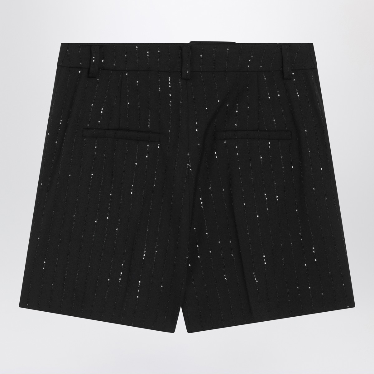 Black shorts with pinstripe-effect embroidered micro sequins, straight cut, high waistband with zip and hook fastening, French pockets, back welt pockets, belt loops and pressed crease.