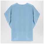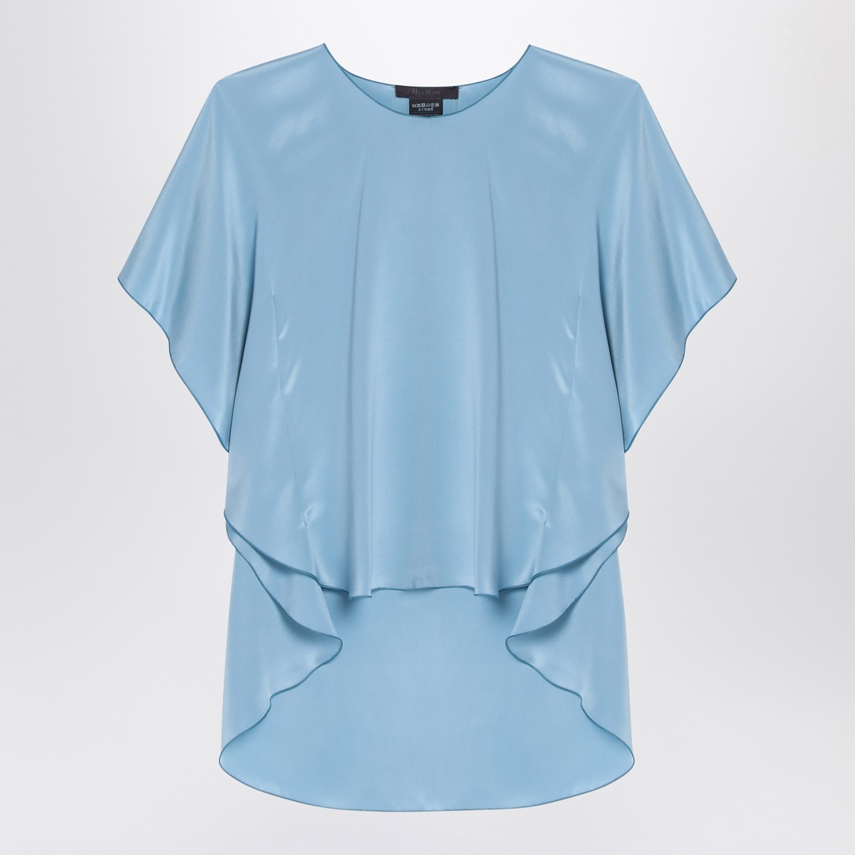 Max Mara Pianoforte blouse in heavy sky blue silk crêpe de chine, characterized by a fluid design, short ruffled sleeves, a wide round neckline, and an asymmetrical rounded hem that is longer at the back.