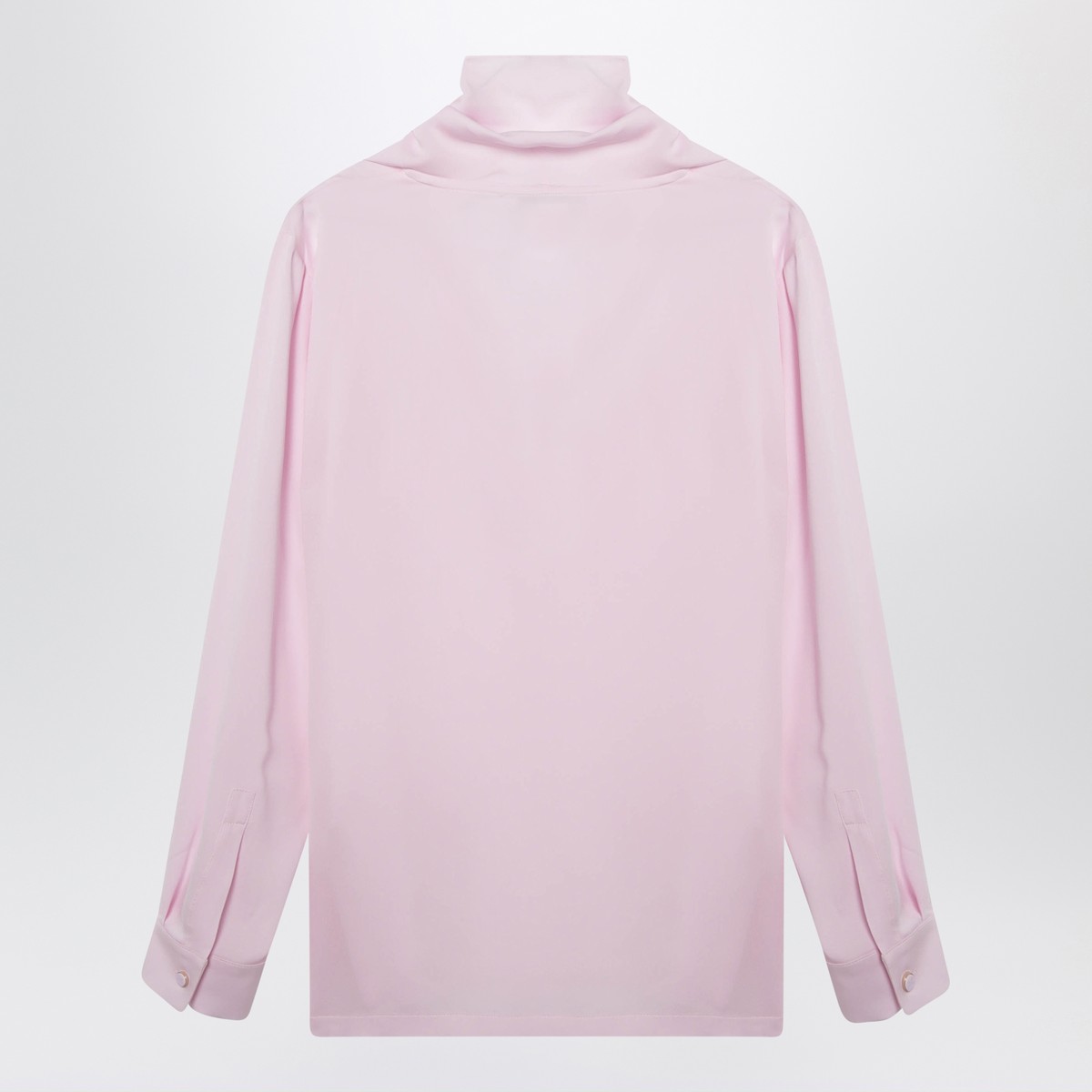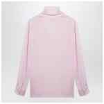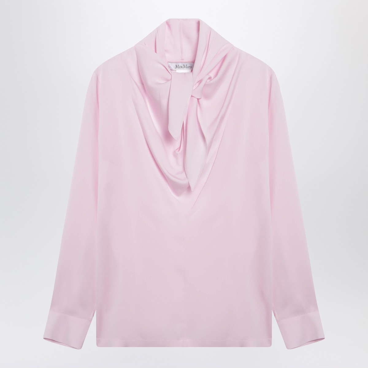 Max Mara blouse in heavy silk charmeuse in light pink, featuring tied foulard neckline, straight fluid line, set-in sleeves with logo-button cuffs and squared side slits.