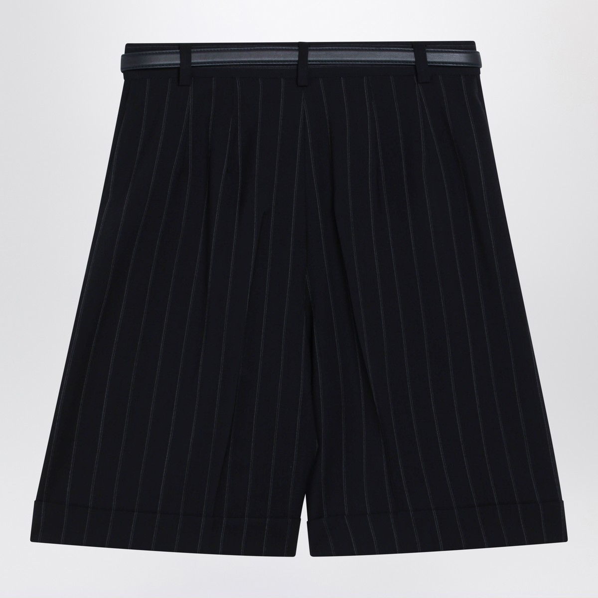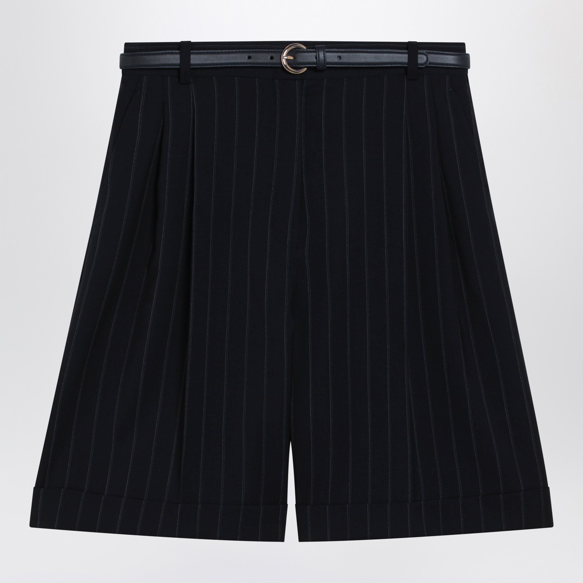 Max Mara Studio blue virgin wool bermuda shorts with pinstripe pattern, featuring belt loops, two side pockets and a matching adjustable belt.