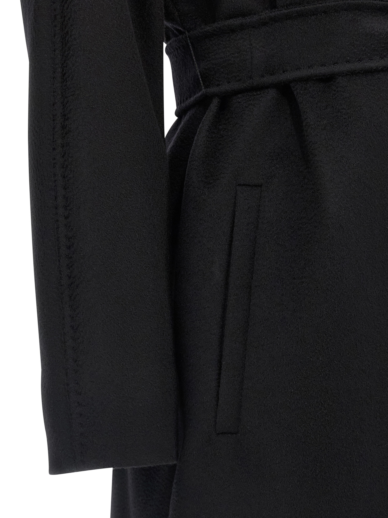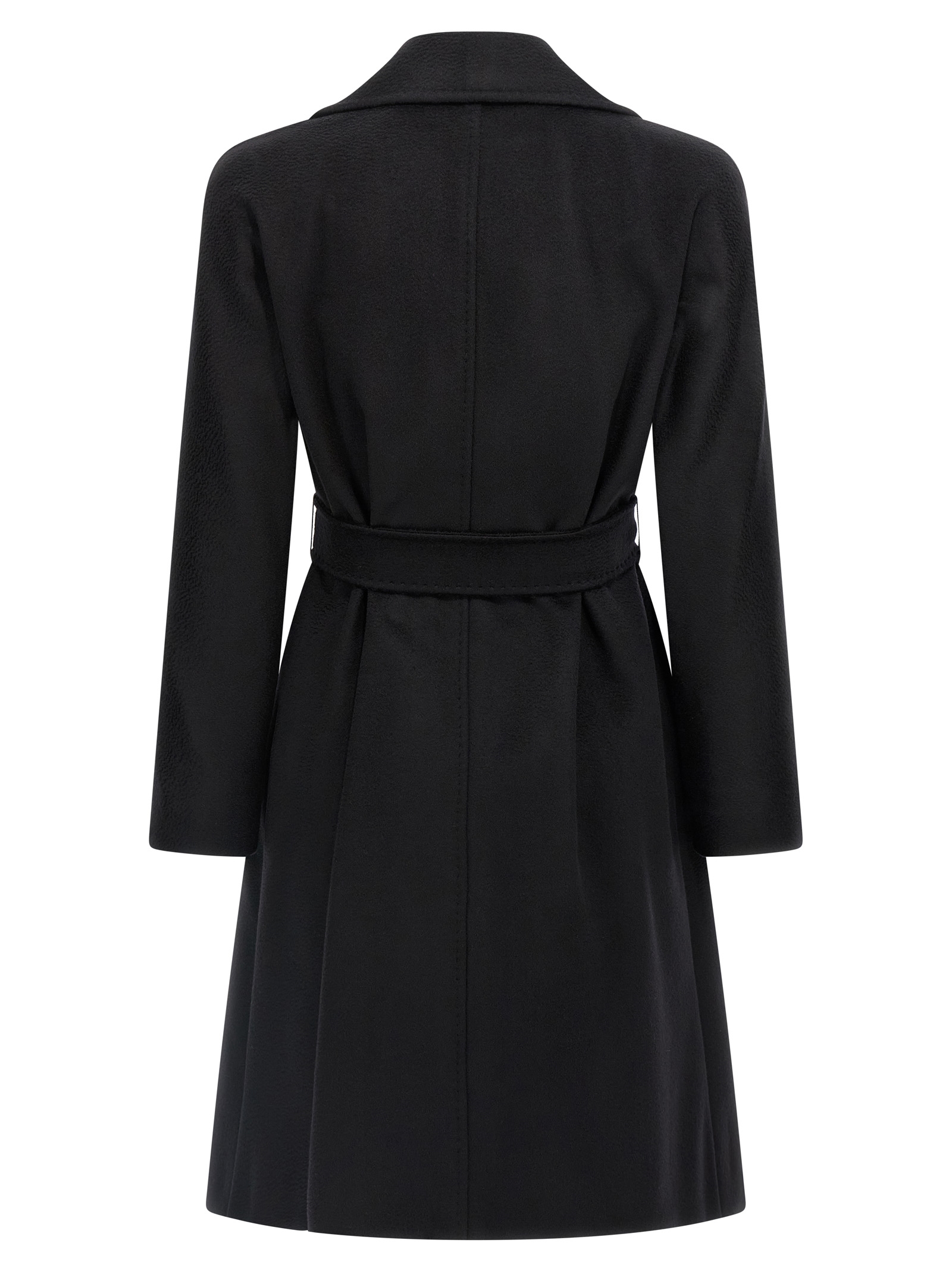 ‘Dravenna’ pure wool drap coat finished with tailored dot, robe style, flared silhouette, lapel collar, pockets, long kimono sleeves, monogram viscose lining, removable belt.