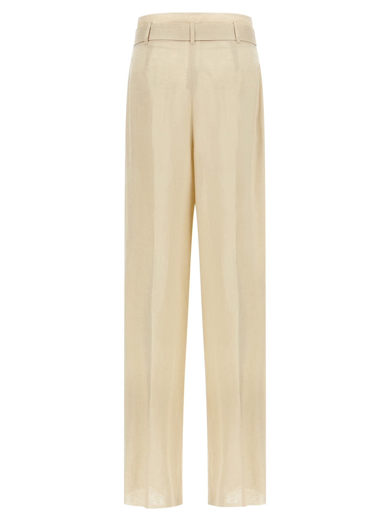 ‘mstmateria’ trousers in pure washed pure linen light canvas, Wide leg, Stretched pleat, Front and back pincer, High waist, Zip hook and front button closure, French pockets with front tailored dot, Hem to be finished, Removable matching belt. Size and Fit – true to size fit
