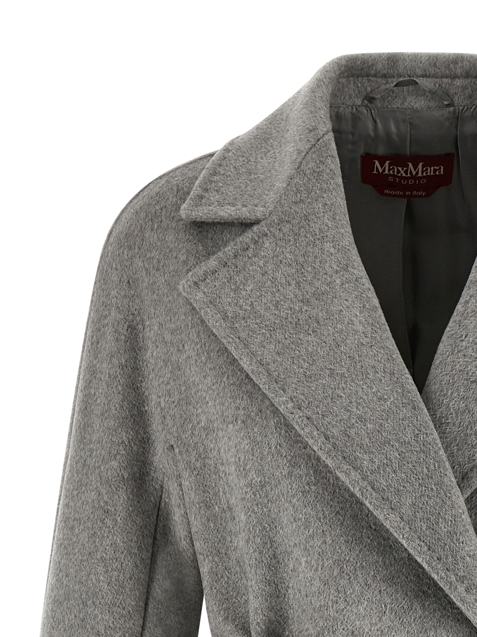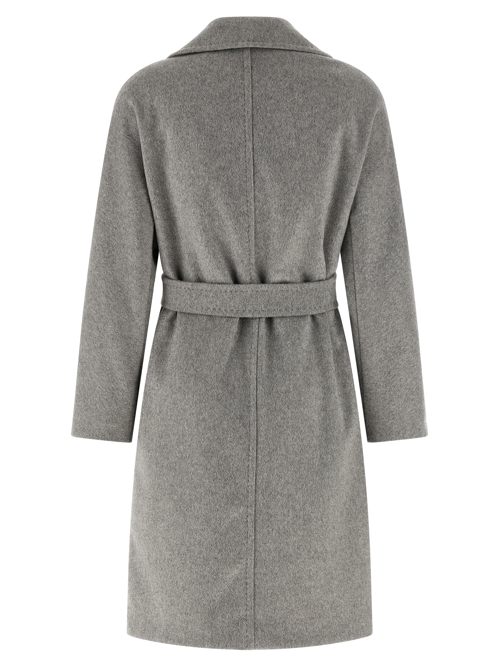 ‘Panteon’ midi coat in pure cashmere, alpaca and wool sable drap with double-breasted button closure and lapel collar, pockets, long kimono sleeves, viscose lining, removable belt.