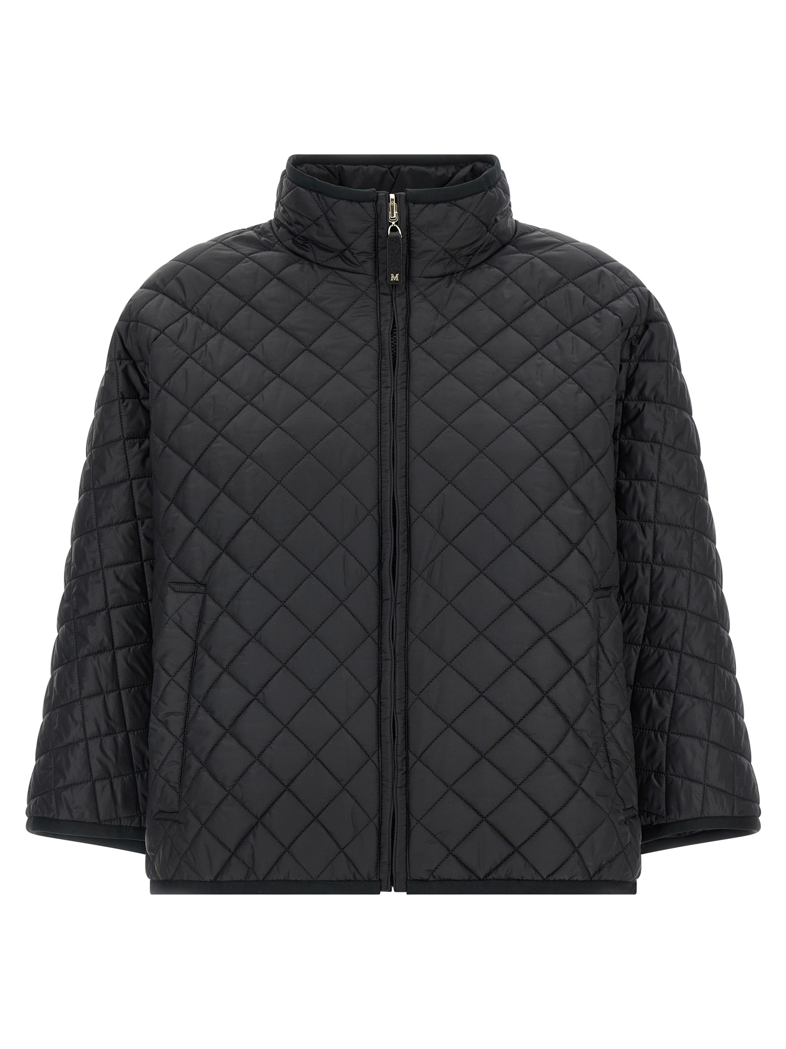 Short reversible cape ‘delfina’ in waterproof canvas padded with cameluxe quilted diamond-shaped on one side and smooth on the other, List collar, Front zip closure, Long kimono sleeves.