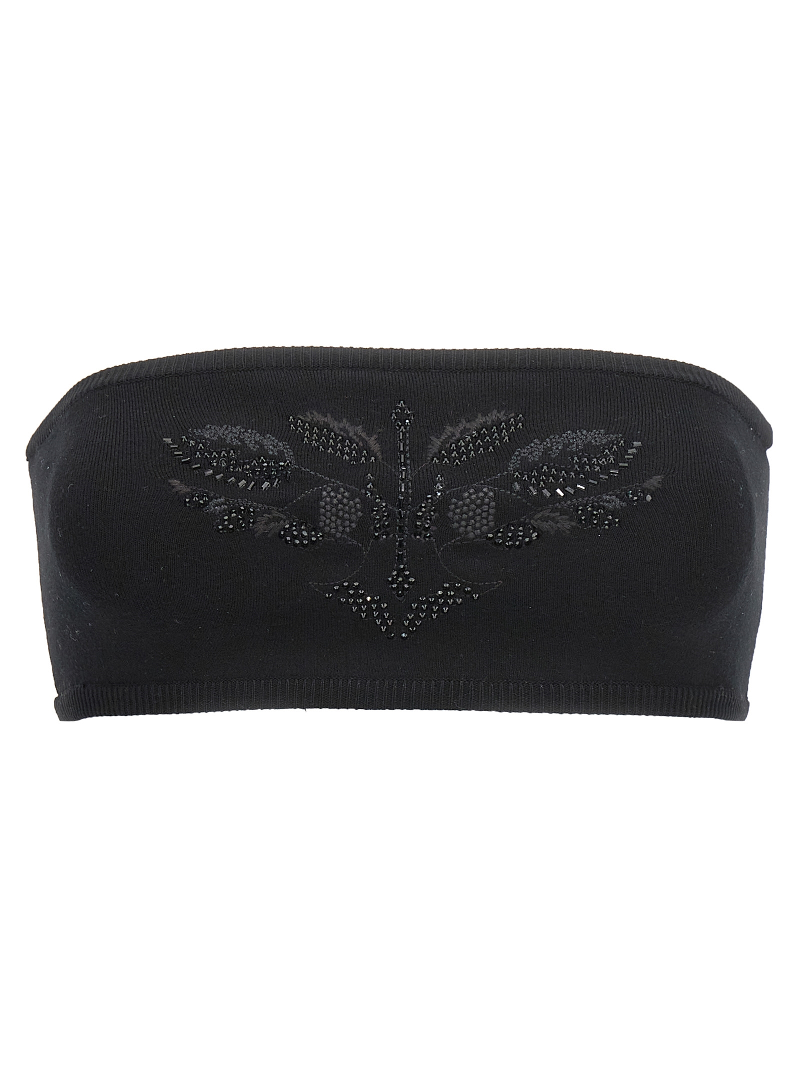 ‘Comune’ bandeau top in stretch viscose knit with thread embroidery and front beads, ribbed edges.
