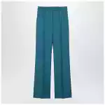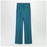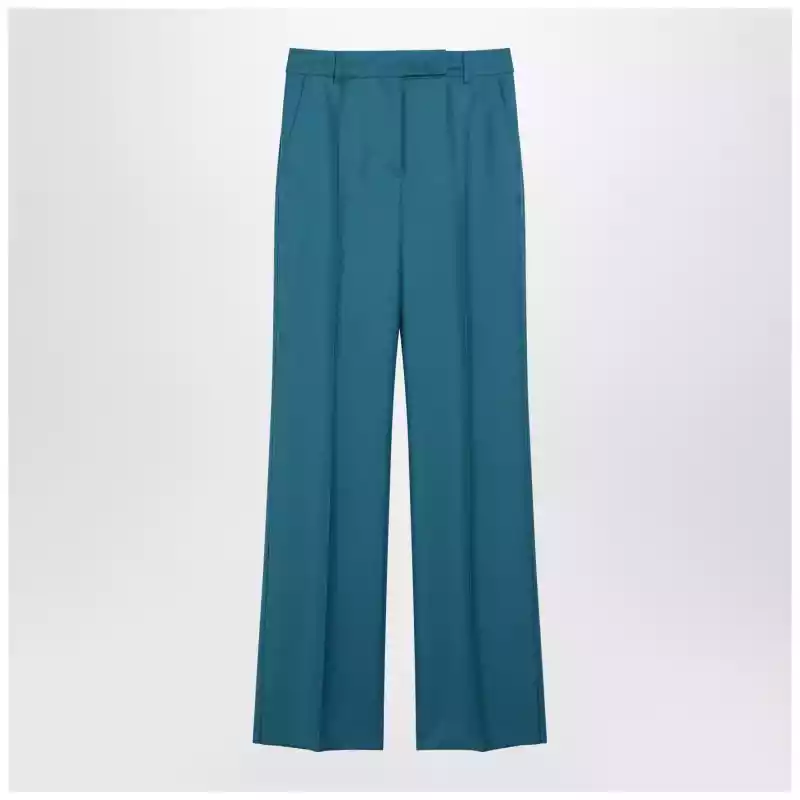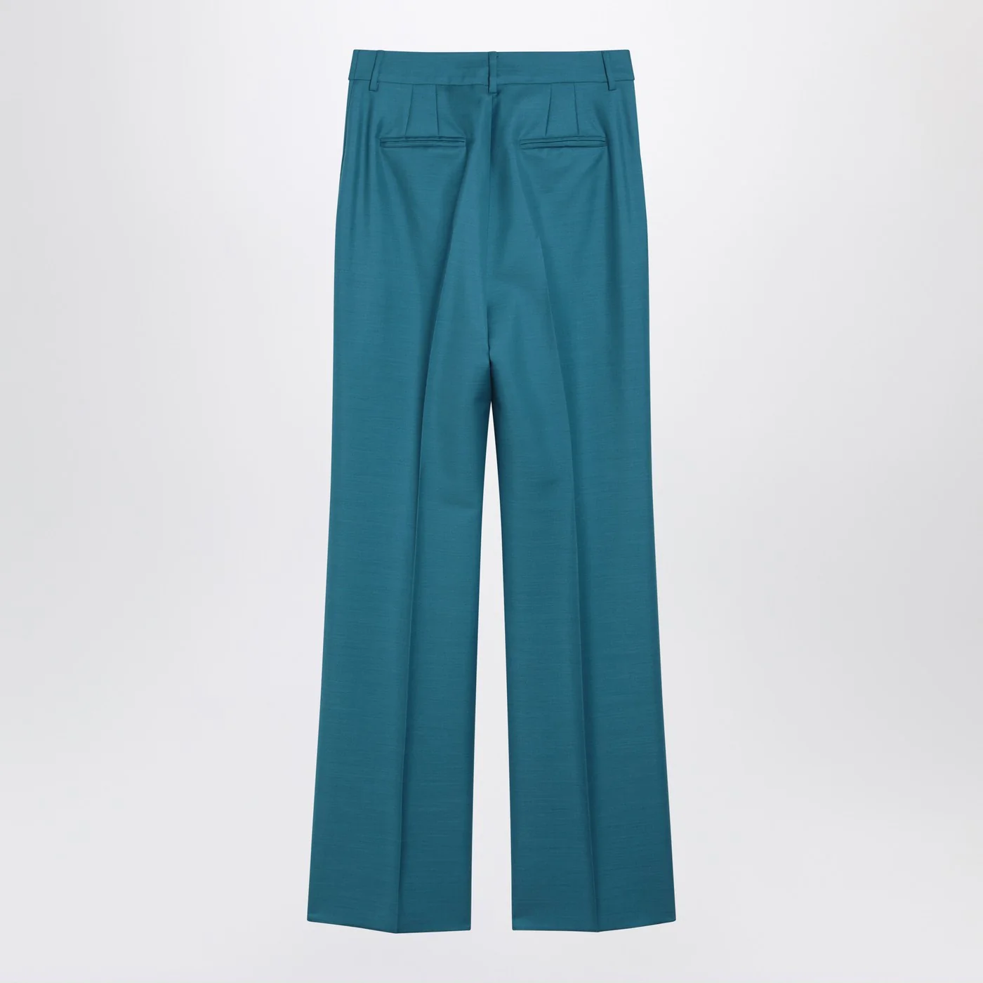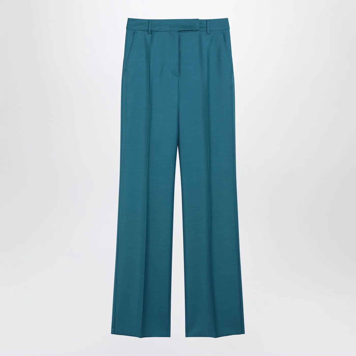 Trousers by Max Mara in turquoise wool and silk blend Belt loops Two side welt pockets Two rear welt pockets Pressed crease front and back Front zip button and hook closure. Size and Fit – Model wears size 40 IT Model measurements: Height: 181 cm Chest: 81 cm Waist: 62 cm Hips: 89 cm