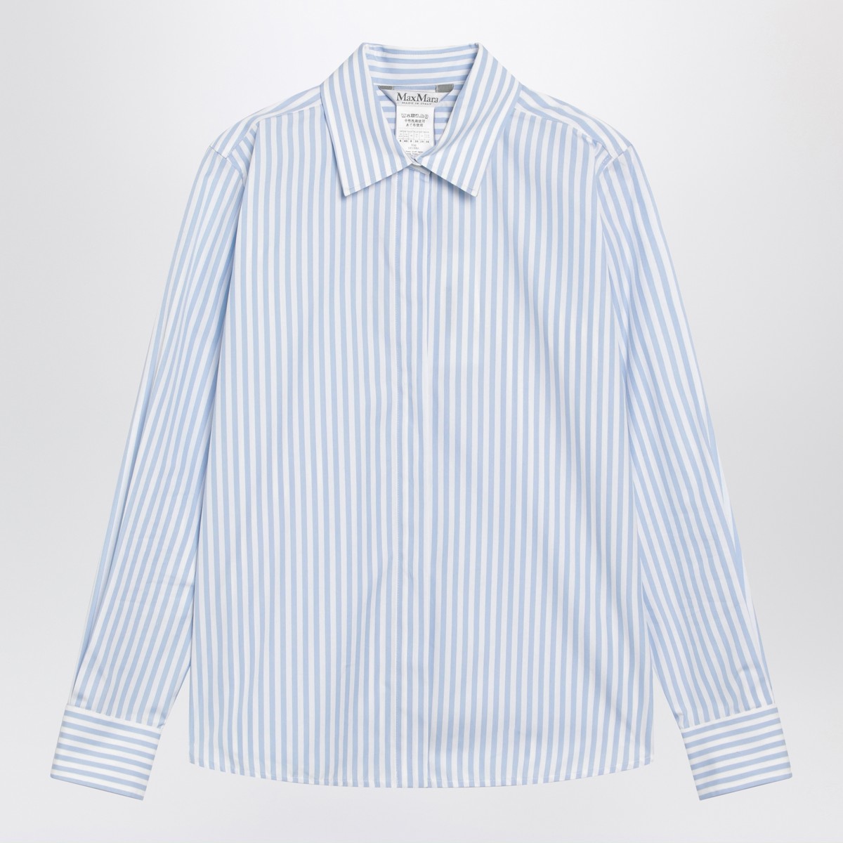 White and light blue striped cotton shirt by Max Mara, featuring a classic collar, long sleeves with buttoned cuffs, concealed front fastening and curved hem.