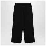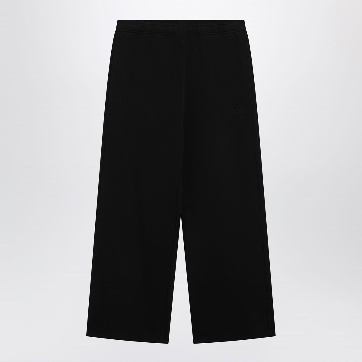 Black cotton jersey trousers by MM6 Maison Margiela, featuring elasticated waist, wide leg, oversized cut, two side pockets, one rear patch pocket, and White Stitch Line on the back.