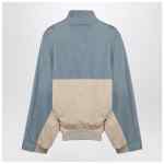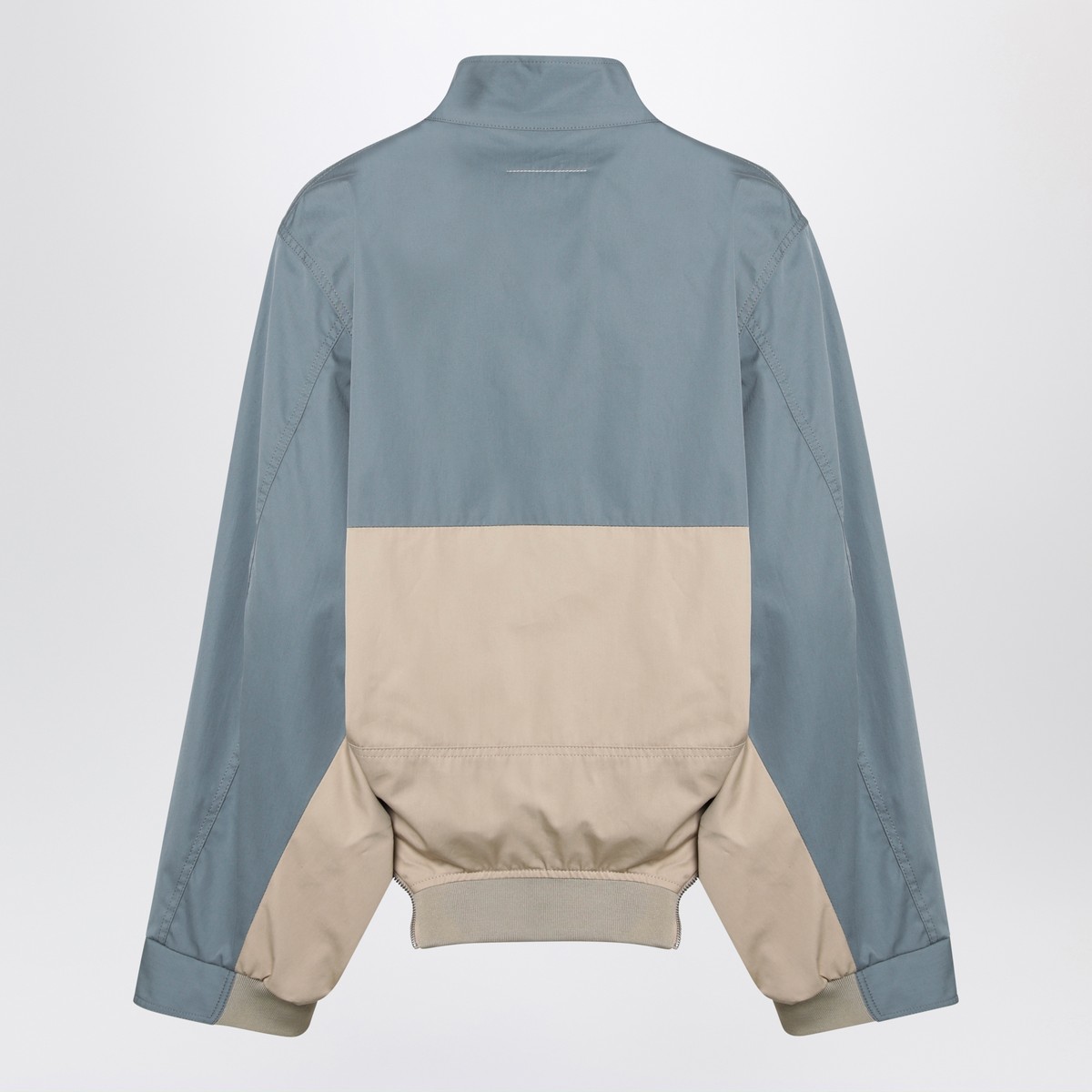 Blue-grey and beige cotton jacket by MM6 Maison Margiela, featuring wide long sleeves, ribbed knit cuffs and trims, tone-on-tone embroidered Numeric Signature logos on the front, high collar with two buttons, double-jacket design with one inverted layer joined at the centre, and White Stitch Line on the back.