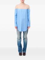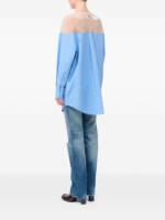 light blue cotton button front cuffed sleeves knit insert white stitch line Cotton shirt.