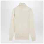 MM6 Maison Margiela white virgin wool sweater, featuring long sleeves, a high collar, ribbed edges, all-over distressed details, and a contrasting Numeric Signature intarsia on the front.