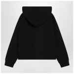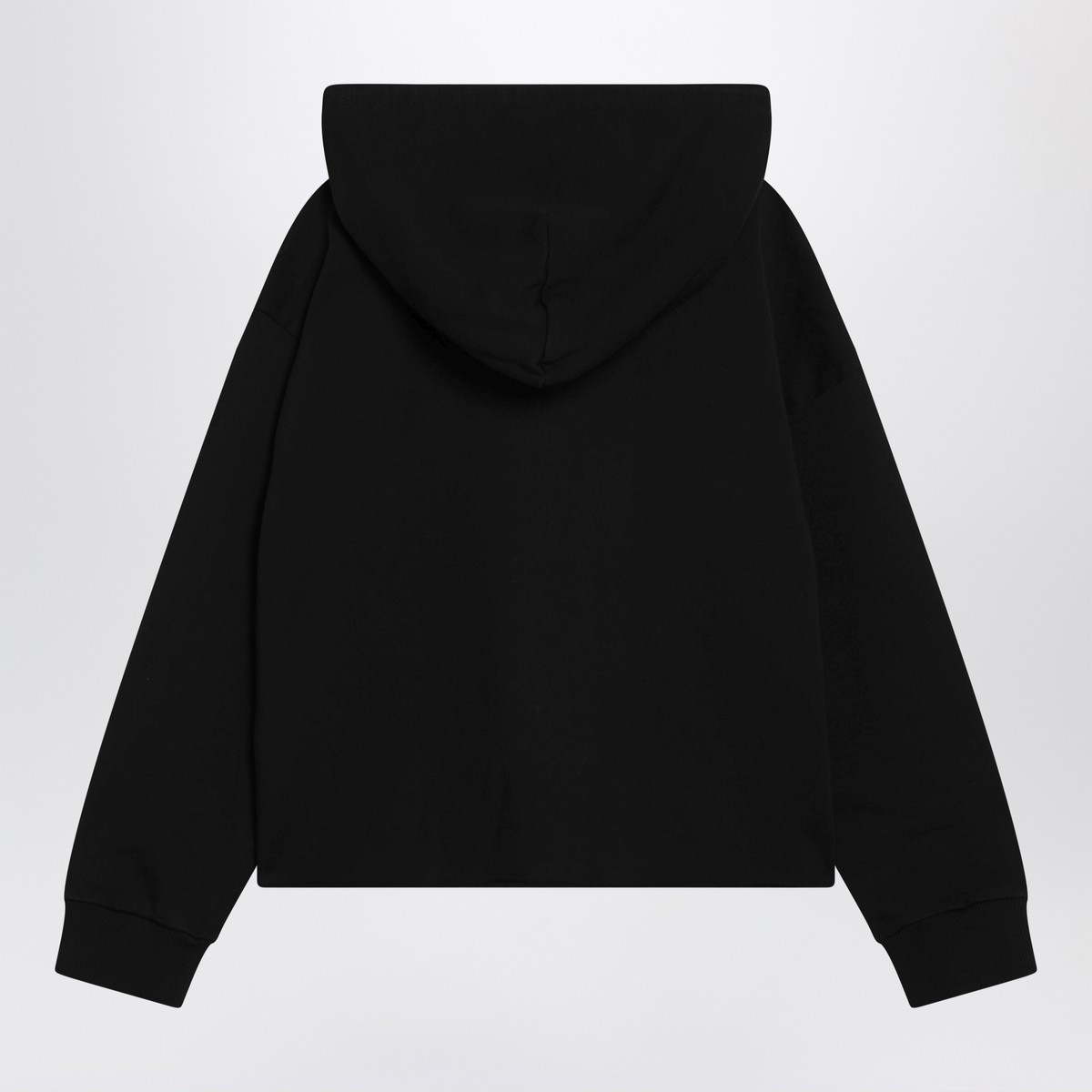 MM6 Maison Margiela black cotton sweatshirt, featuring a drawstring hood, MM6 Numeric signature on the front, dropped shoulders, raw-cut hem, ribbed cuffs and white stitch line on the back.