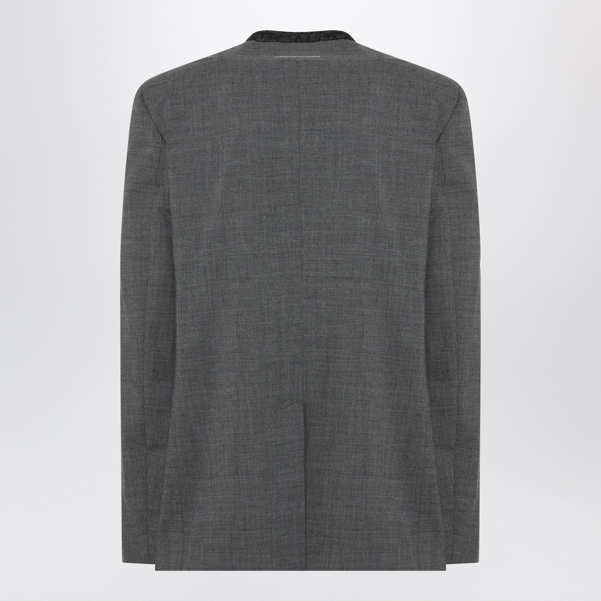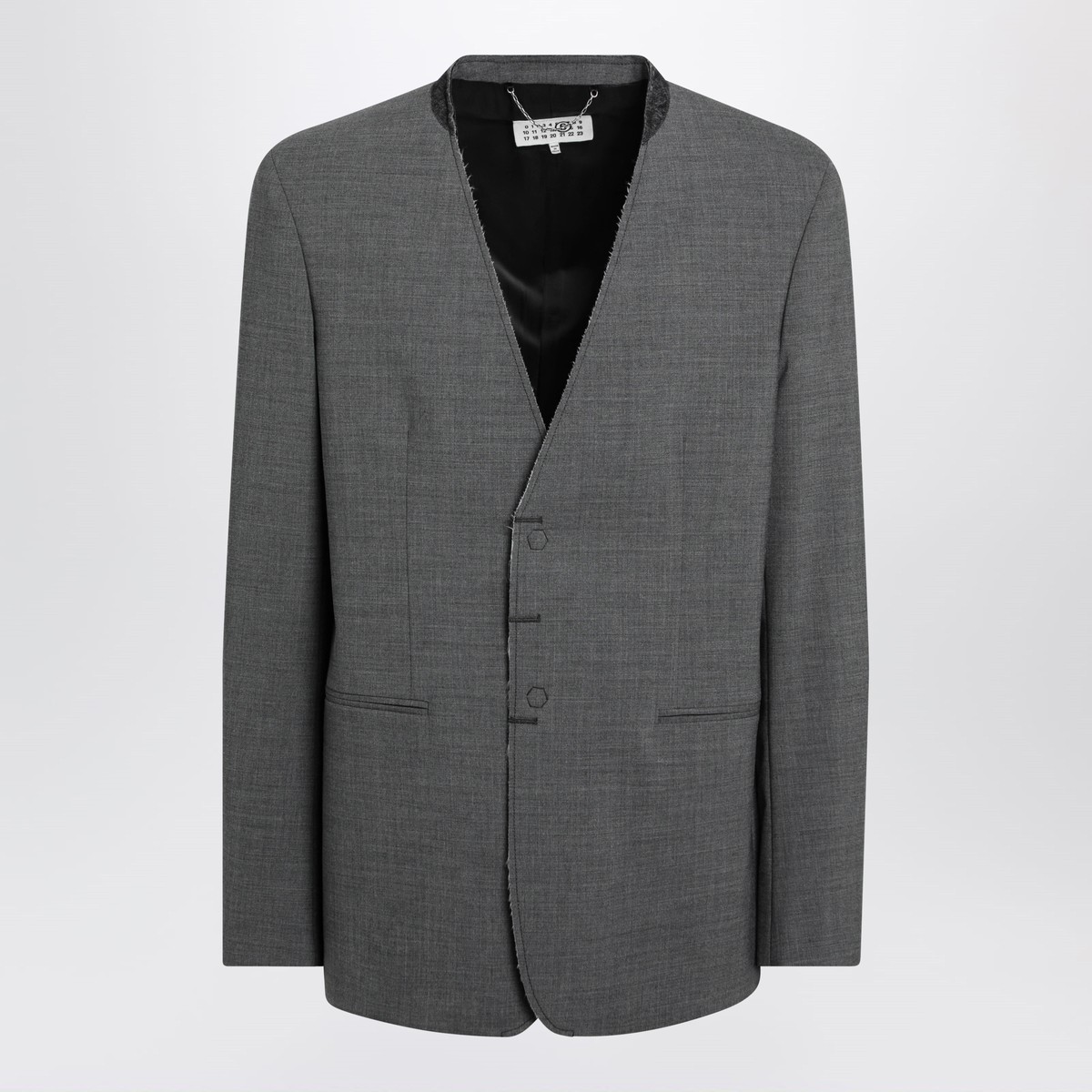 Grey mélange wool-blend single-breasted jacket by MM6 Maison Margiela, featuring back vent, long sleeves, front closure, two front welt pockets, collarless design, and raw-cut finishes.