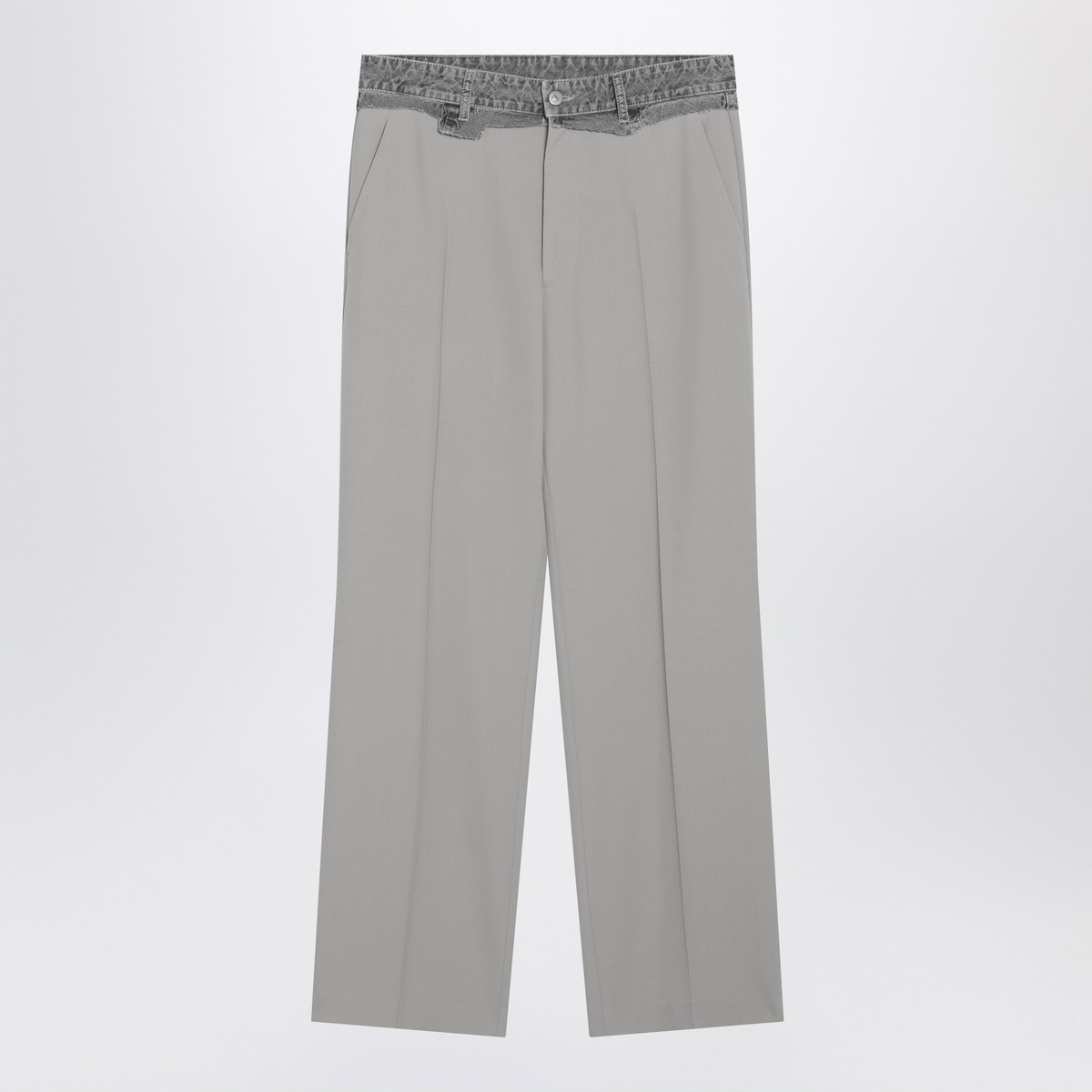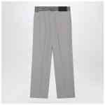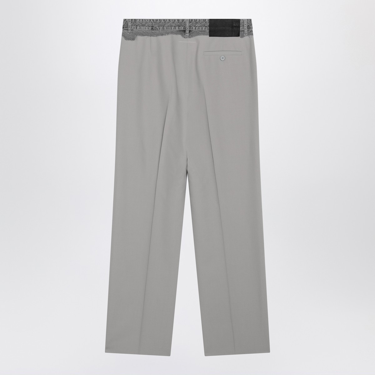 MM6 Maison Margiela grey wool-blend trousers, featuring jeans-style waistband with belt loops, front zip and button closure, rear logo patch, two side welt pockets, one rear welt pocket with button, White Stitch Line on the back and pressed creases front and back.