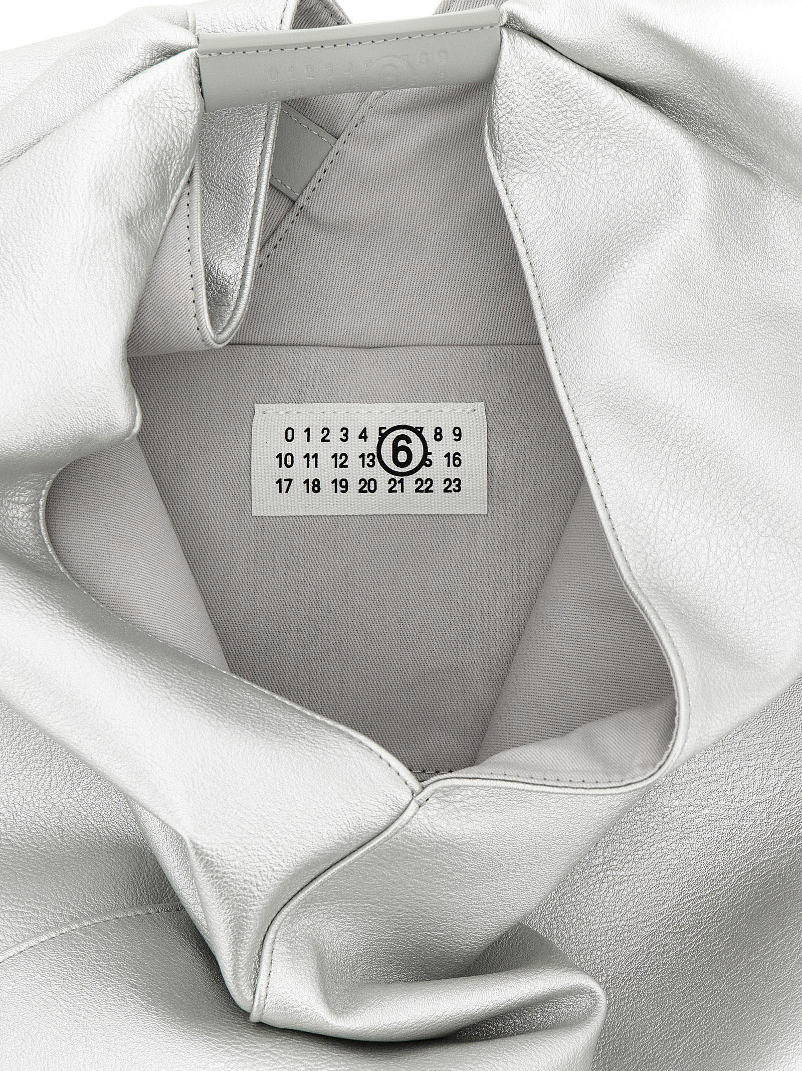 ‘Japanese Classic’ handbag in hammered laminated leather-effect fabric, fixed smooth leather handle with embossed ‘Numeric Signature MM6’, internal snap button closure, back ‘White stitch line’, origami inspired triangular pleats with snap buttons.