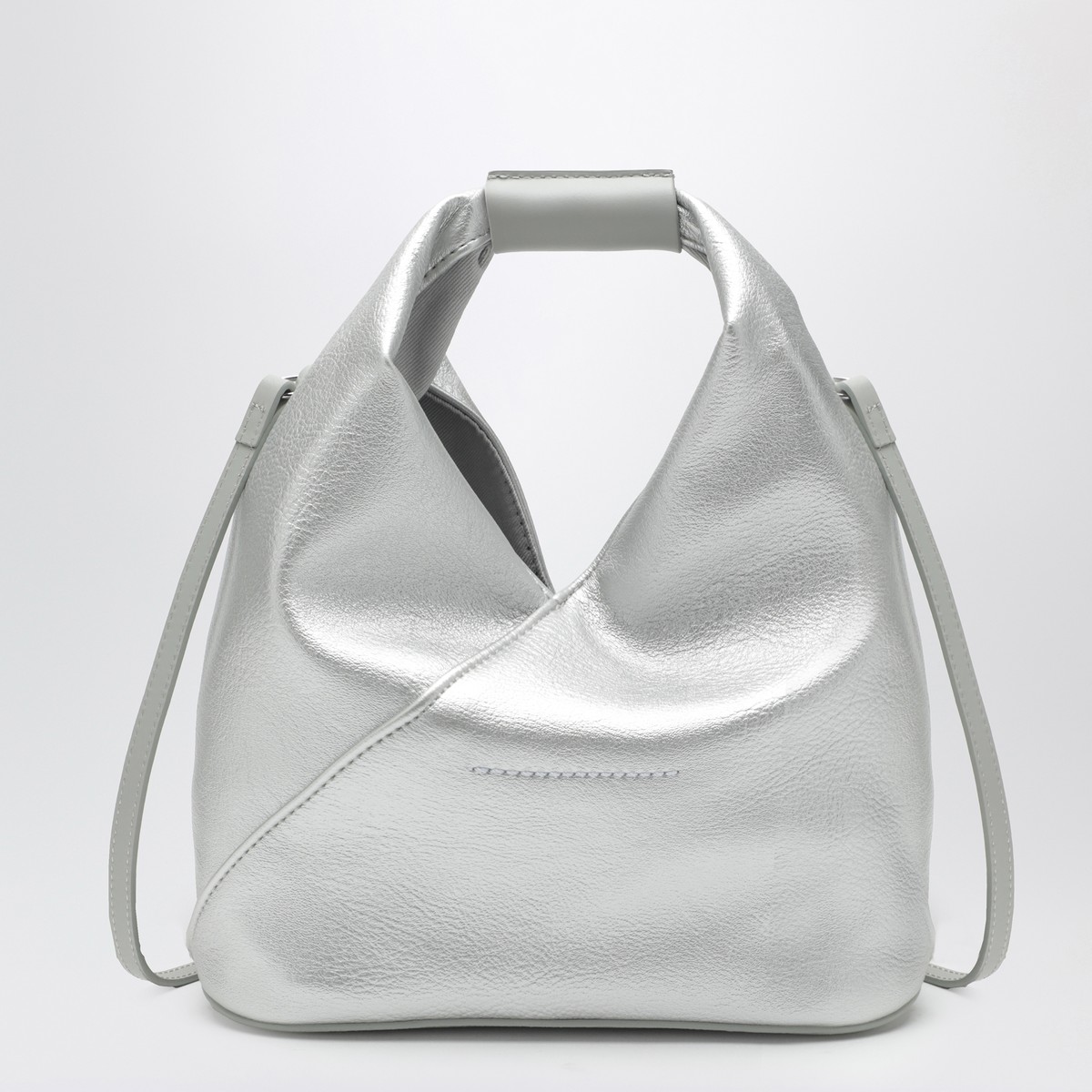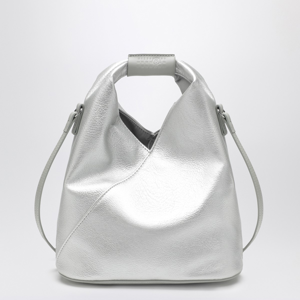 MM6 Maison Margiela small bag in silver faux leather, featuring a handle with MM6 Numeric Signature, magnetic closure, White Stitch line on the back and adjustable shoulder strap.