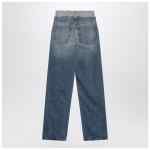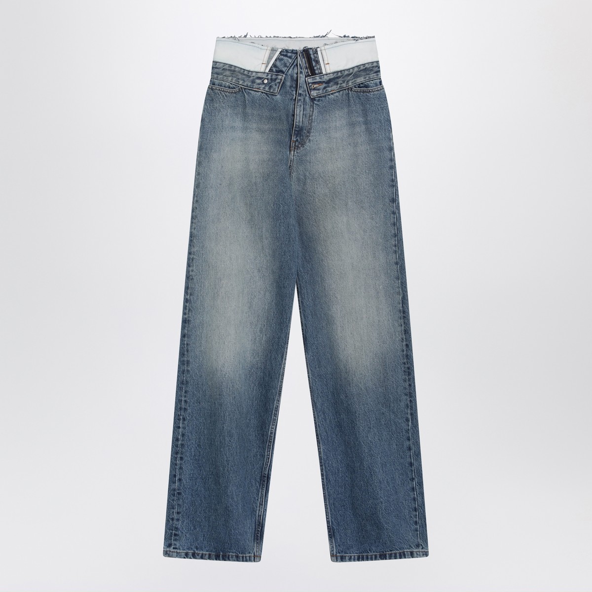 MM6 Maison Margiela light blue washed cotton denim jeans, featuring a straight leg, layered waistband insert creating a double effect with visible edges and internal structure, two side pockets, two back pockets, and the signature White Stitch Line on the back.