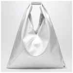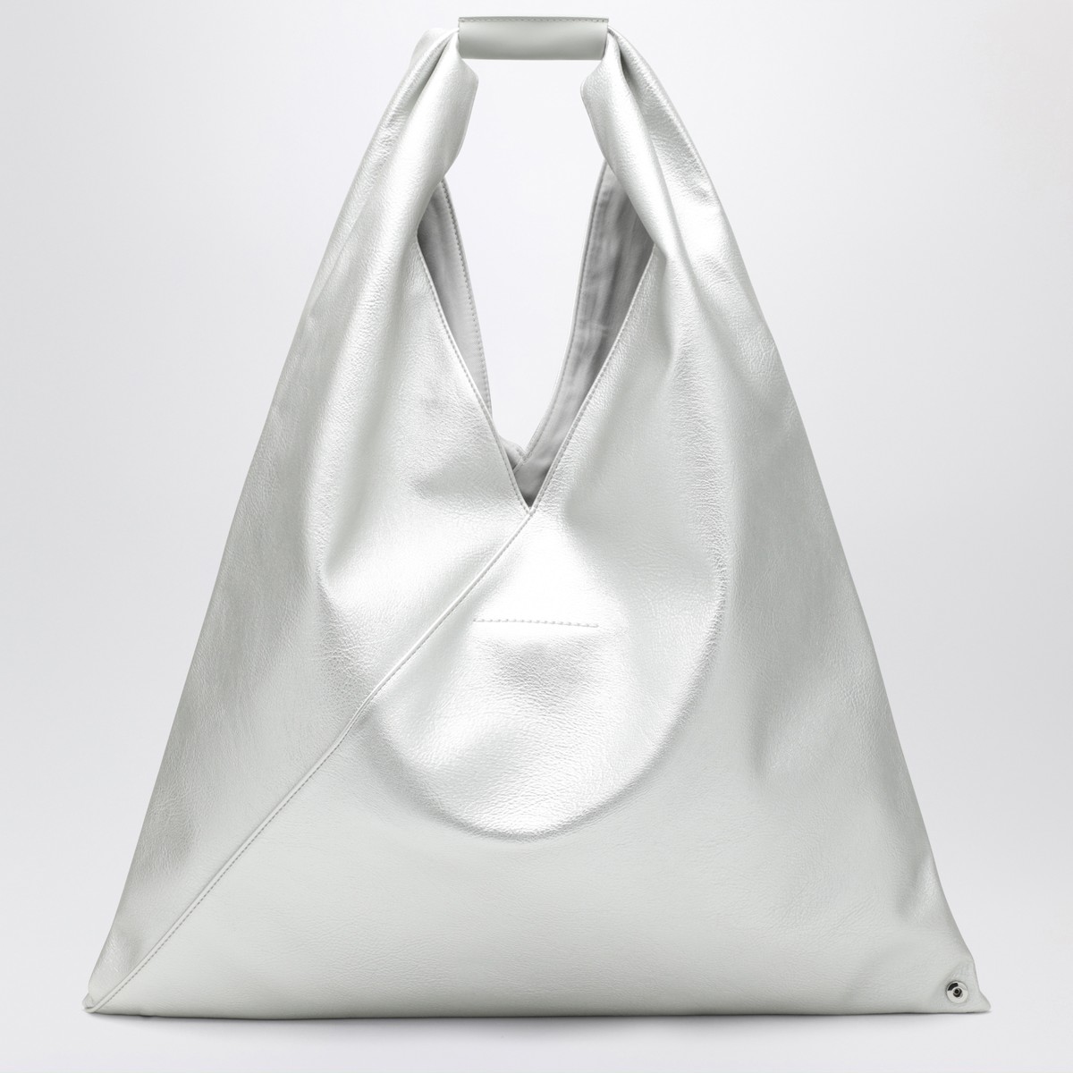 MM6 Maison Margiela medium top-handle bag in silver eco-leather, featuring a leather handle with MM6 Numeric Signature, button closure, White Stitch line on the back, and two snap buttons on the edge.