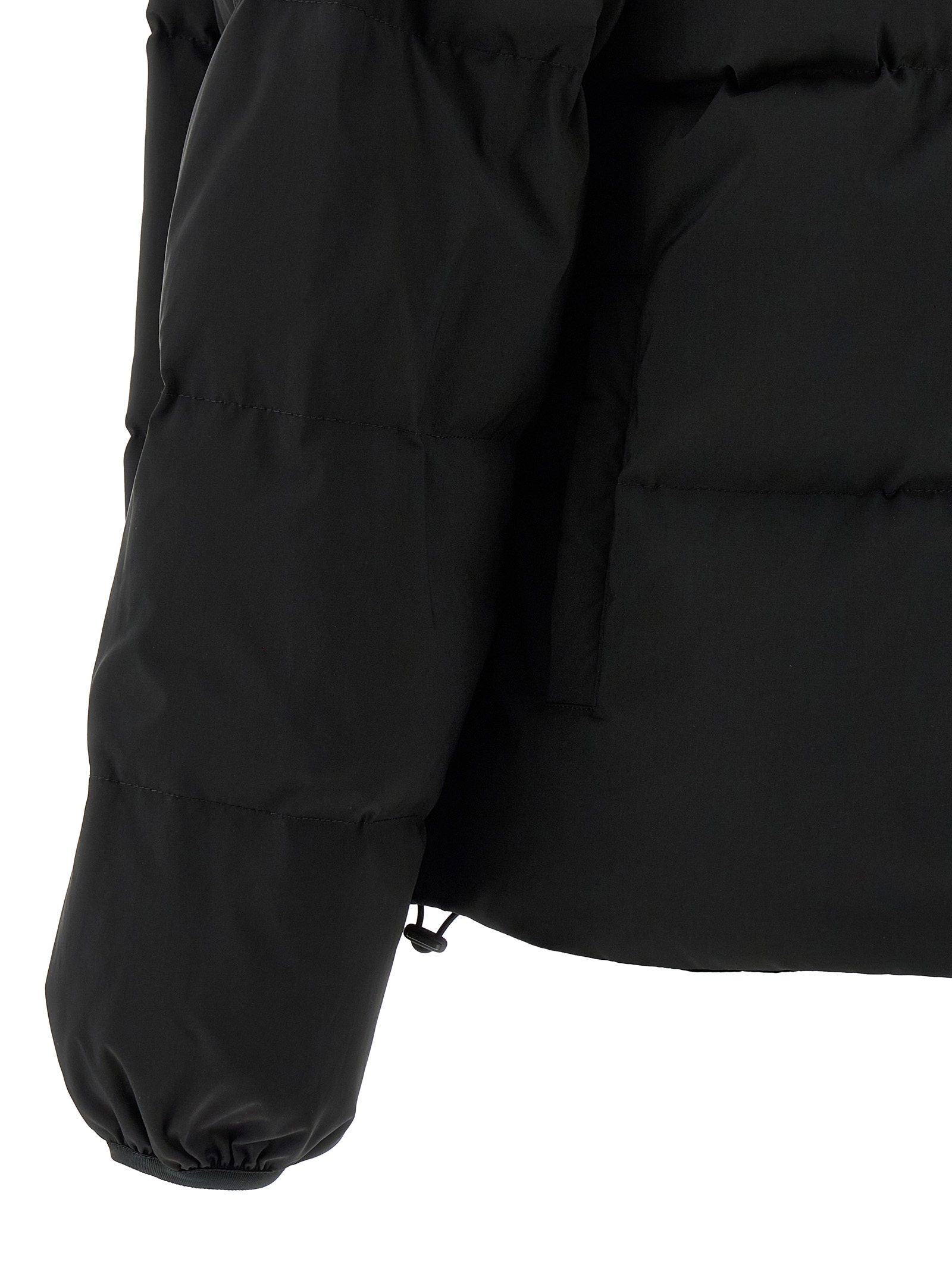 Quilted and goose feather padded fabric down jacket, tone-on-tone ‘Numeric signature MM6’ embroidery and front zip closure, funnel-shaped high neck, pockets, removable long sleeves with elastic, drawstring at the hem, back panel expandable with zip.