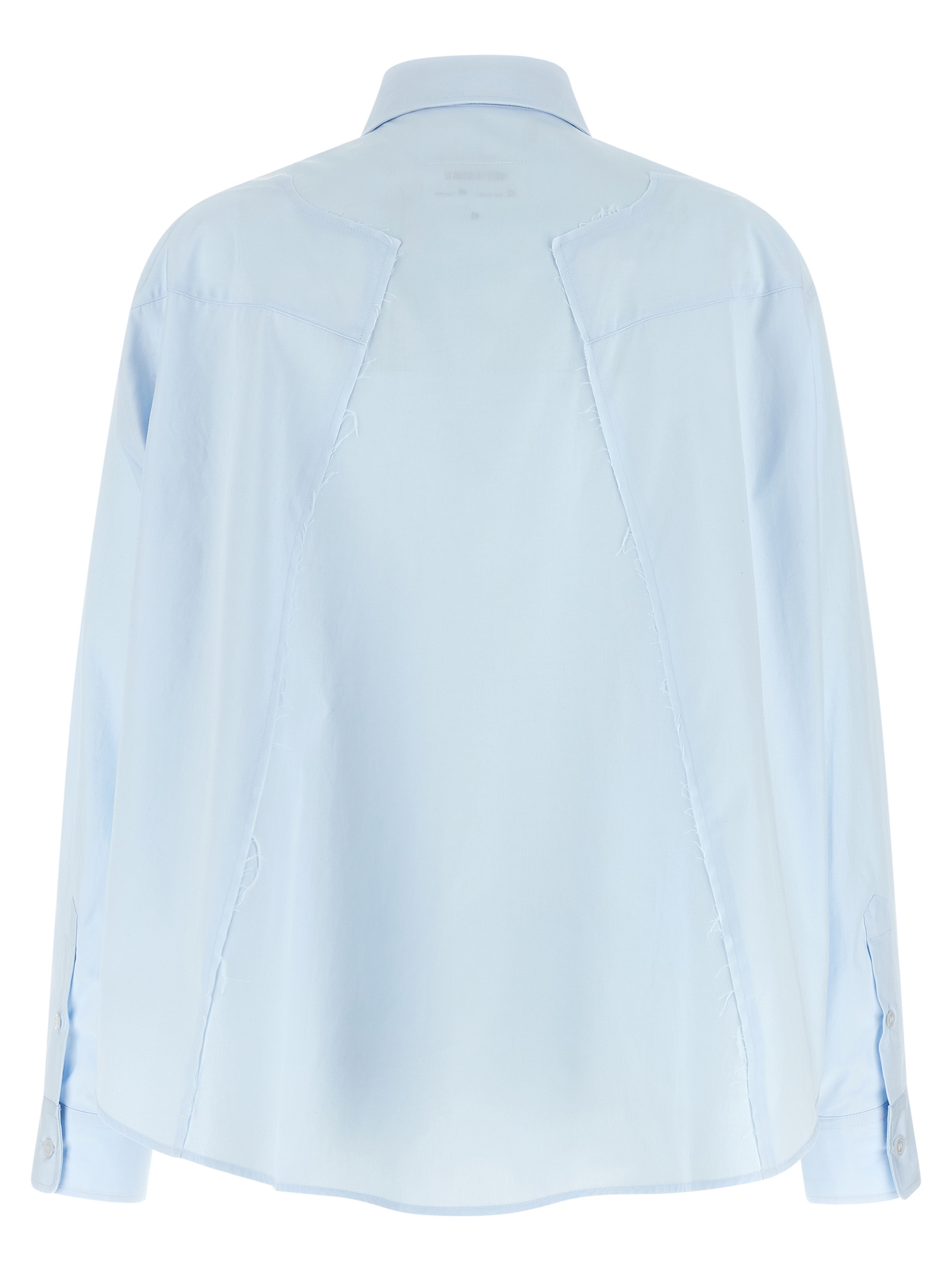 Cotton poplin shirt, collar, front button closure, asymmetric length, raw cut back inserts, long cuffed sleeves.