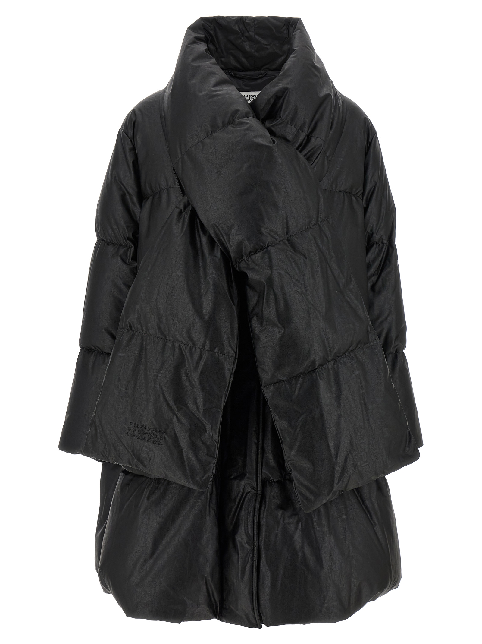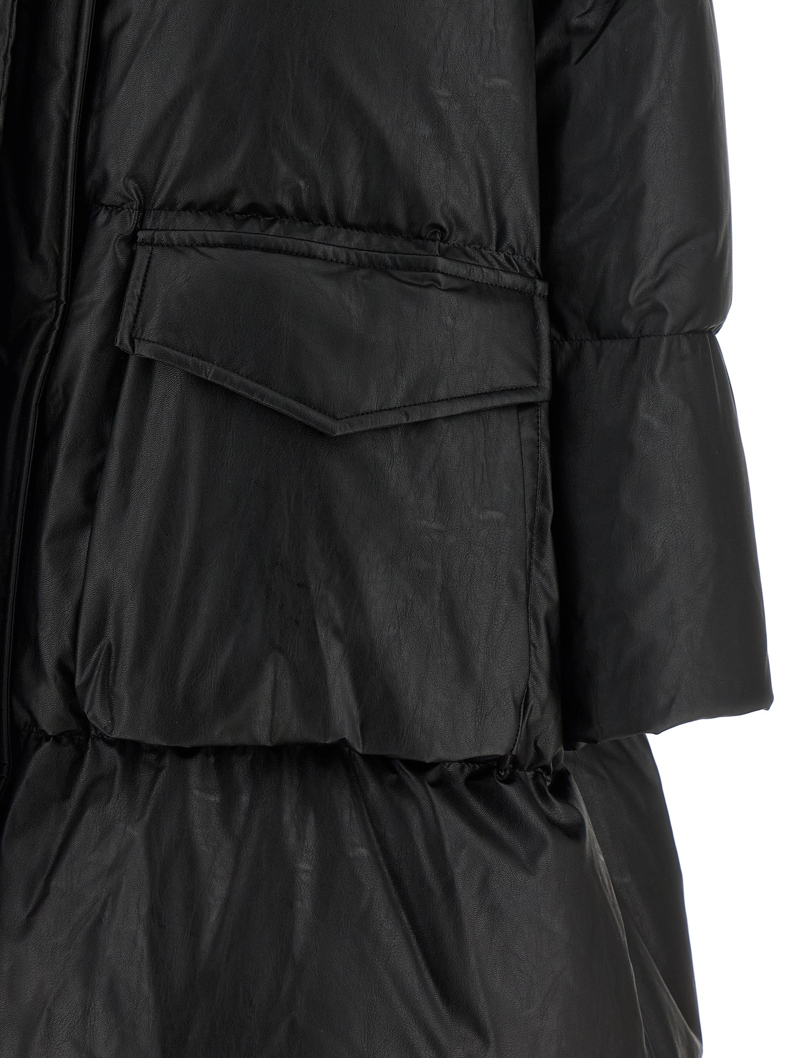 Long down jacket in quilted leather-effect coated viscose with goose down padding, collar with scarf insert to tie or leave along the waist, zip and snap button closure on the front, pockets, long sleeves with knitted cuffs.