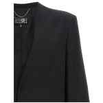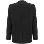 Single-breasted wool blend blazer with raw cut hem collar, Snap button closure, Pockets, Long sleeves, Padded shoulders, Slit and ‘white stitch line’ at the back.