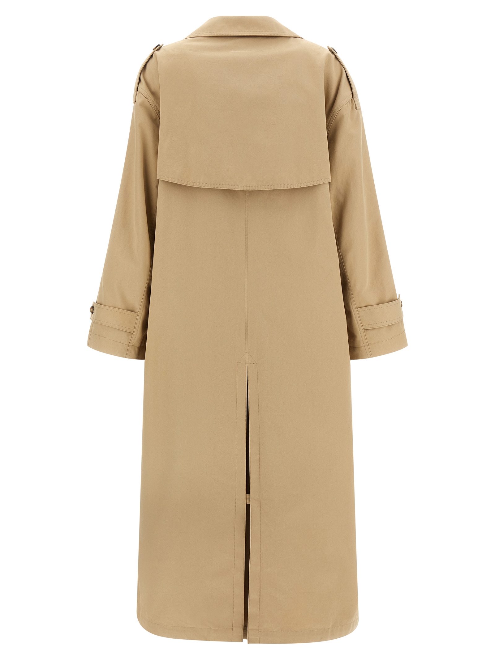 Light double-breasted trench coat in light cotton twill with front horn button closure, Lapel collar, Pockets, Contrast lycra gloves detail stitched at the waist, Sash on the shoulder, Long sleeves, Cape with ‘white stitch line’, Back split.