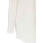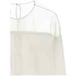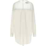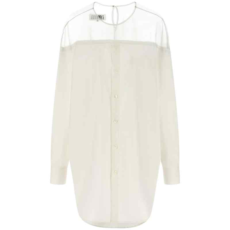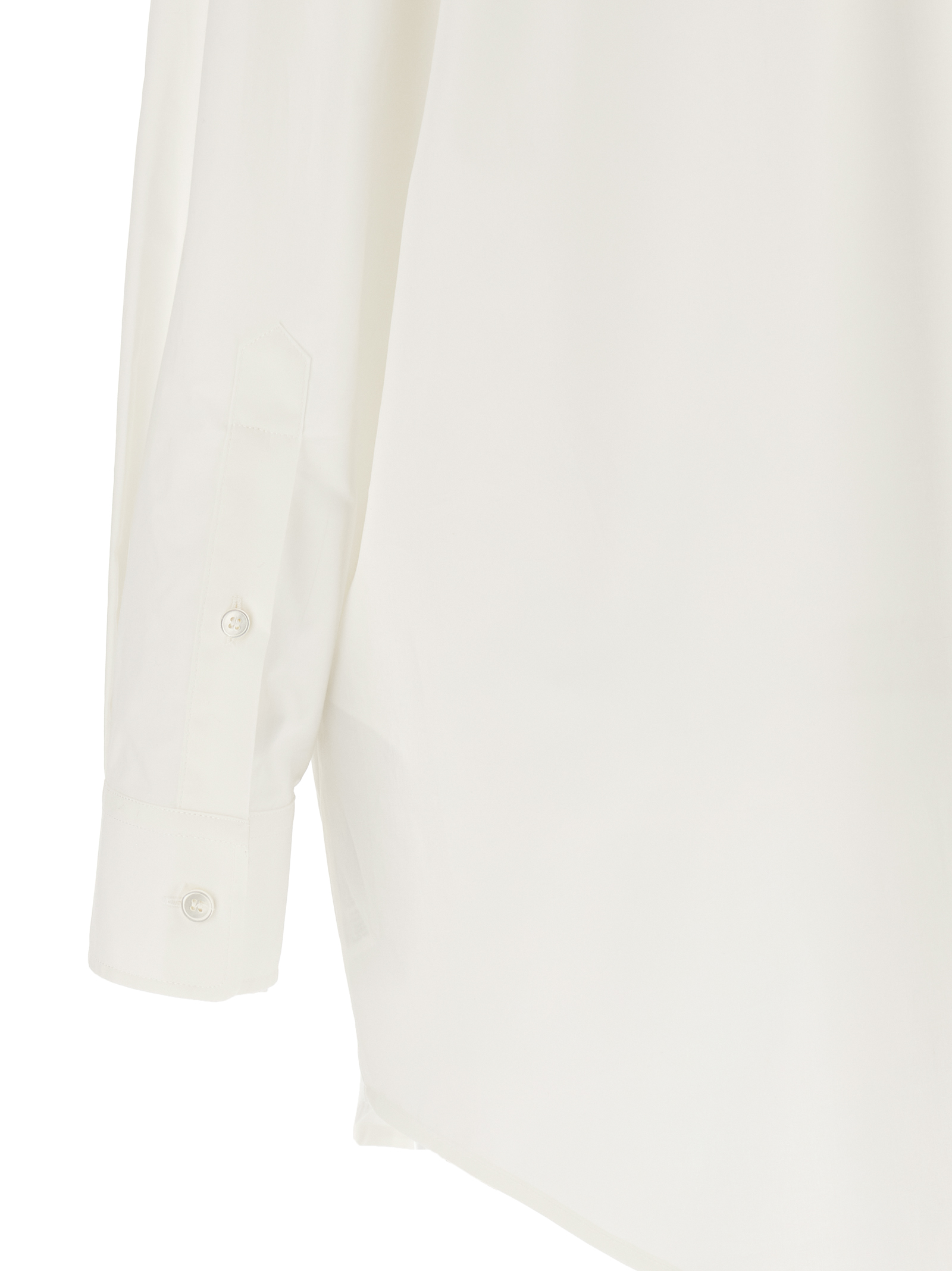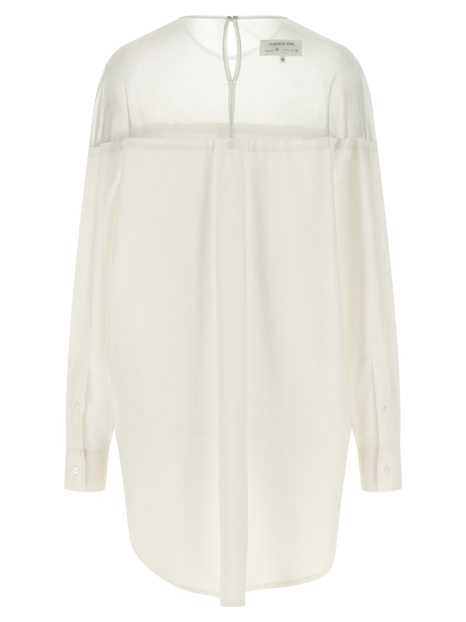 Cotton poplin shirt with semi-transparent top tulle insert, Crew neck with back button closure and cut-out teardrop detail, Breast pocket, Front mother-of-pearl button closure, Long cuffed sleeves, Back rack with cannon pleats, Rounded hem. Size and Fit – Oversized fit