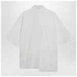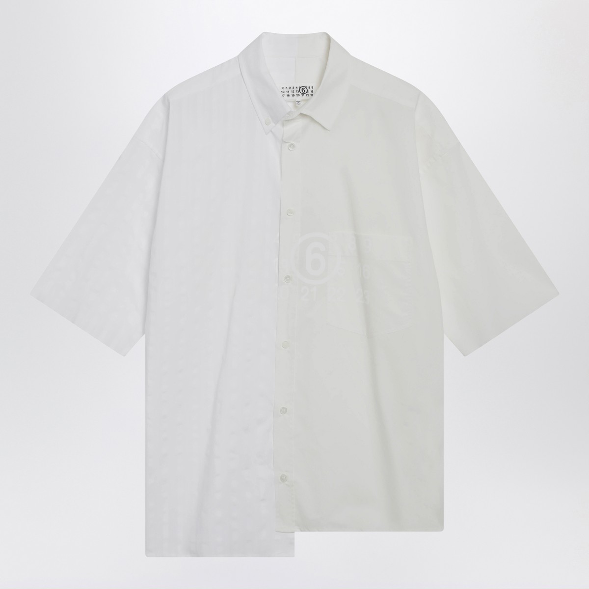 MM6 Maison Margiela shirt in poplin and striped shirting fabric, featuring a classic collar, front closure with flat buttons, short sleeves, and a white stitch line on the back.