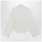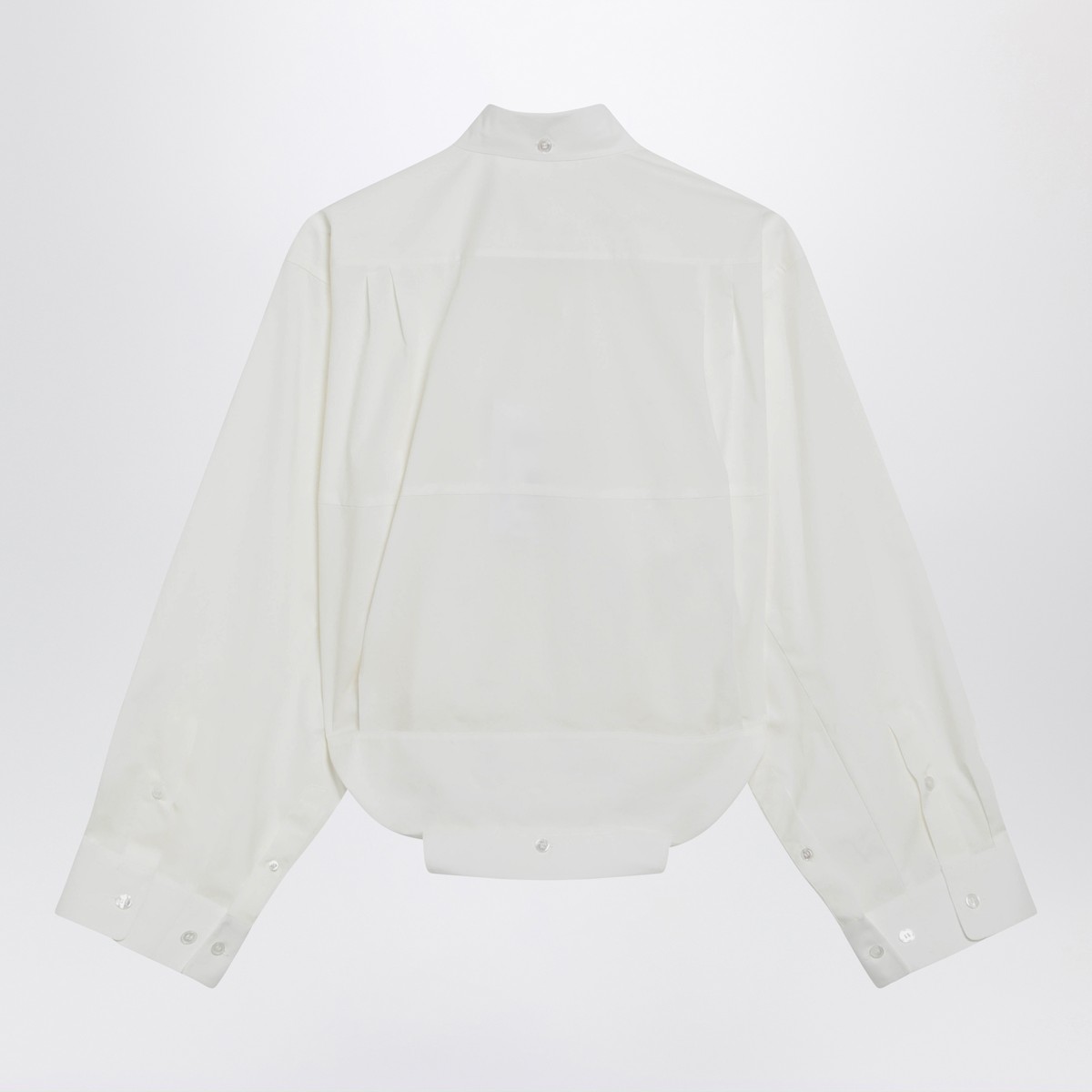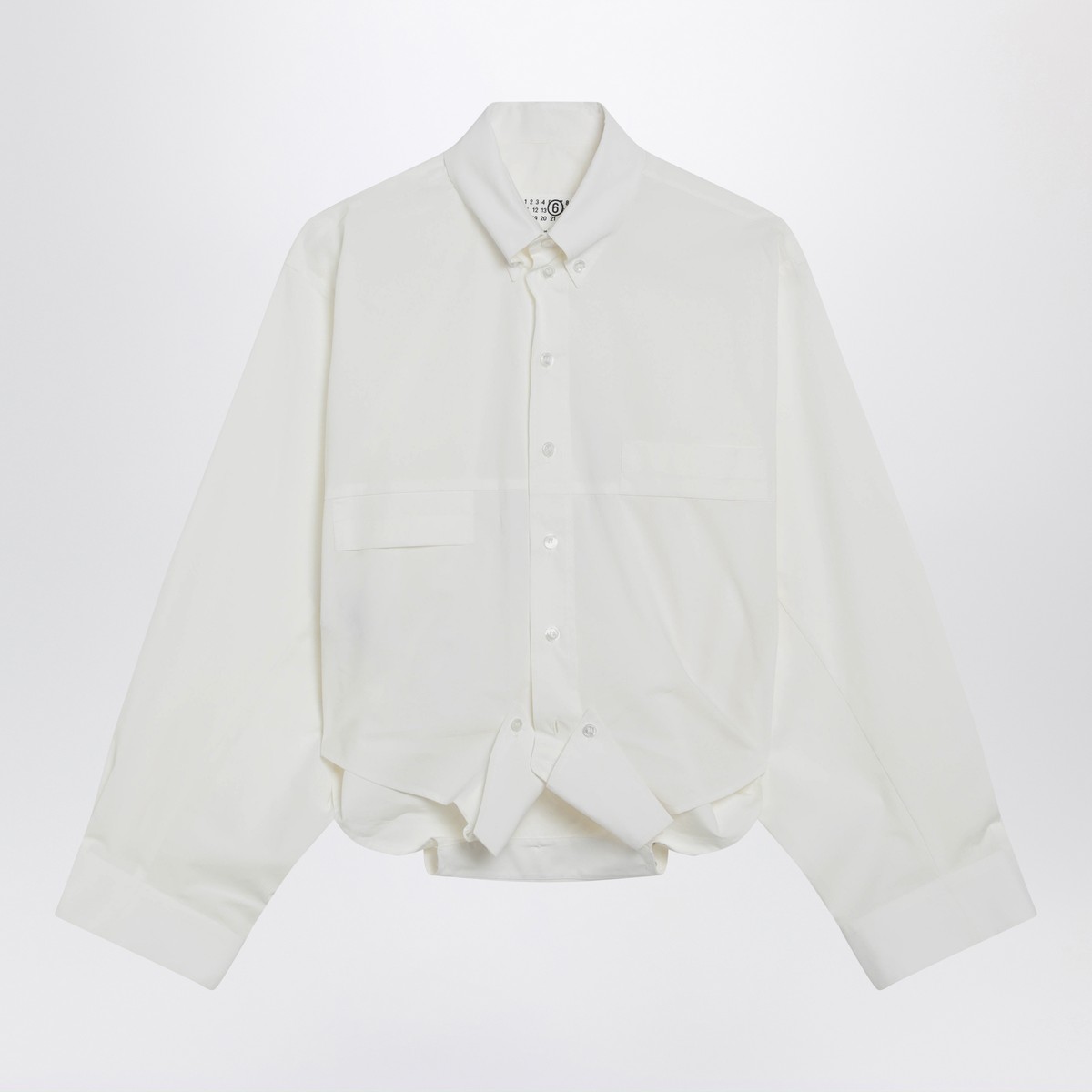 MM6 Maison Margiela white cotton poplin shirt, featuring mirrored construction with doubled and inverted panels, applied chest pockets, button-down pointed collar, long sleeves with buttoned cuffs, front button closure and White stitch line on the back.